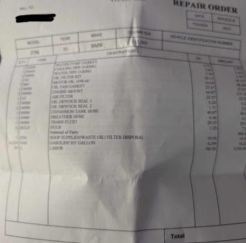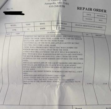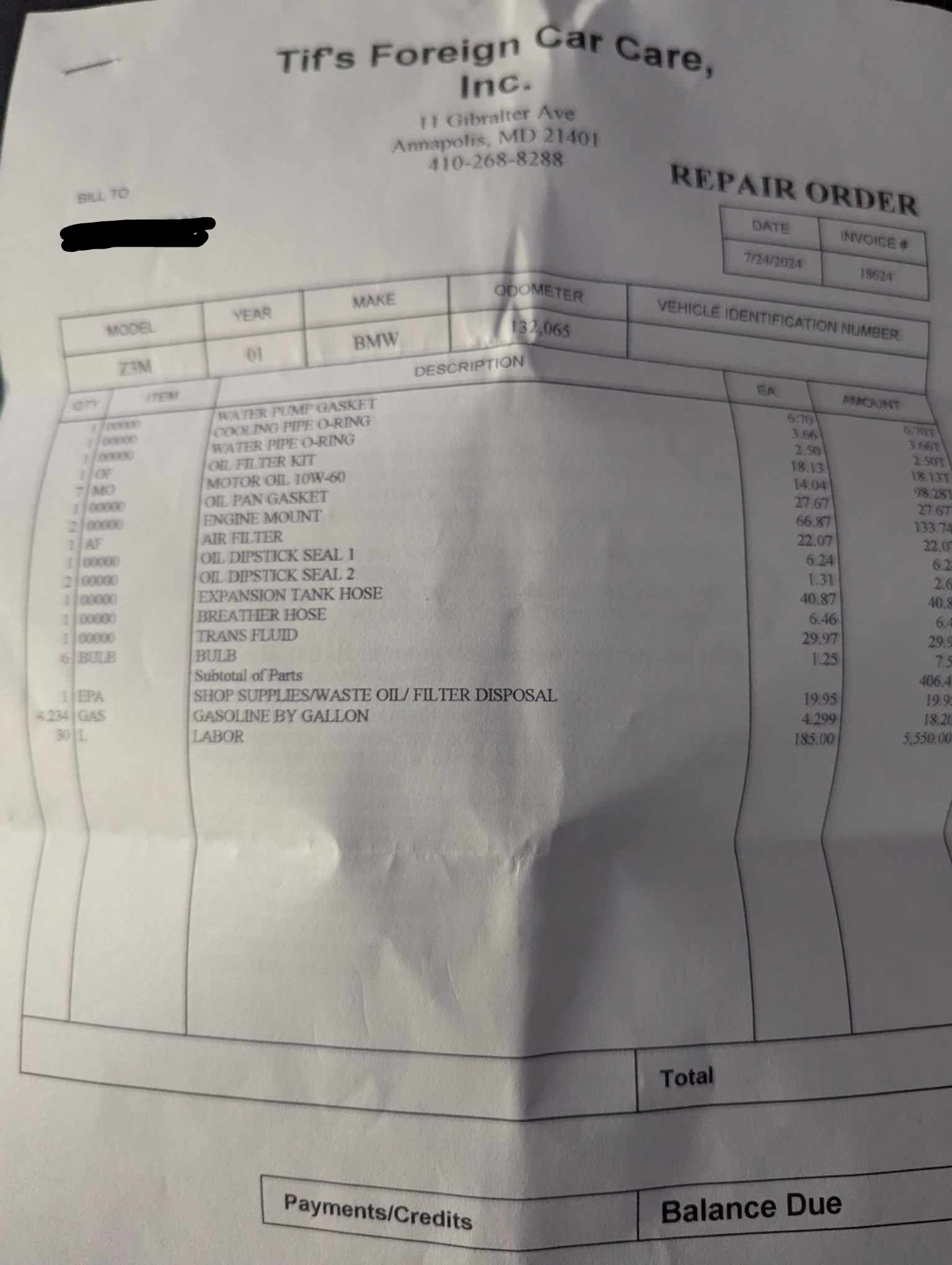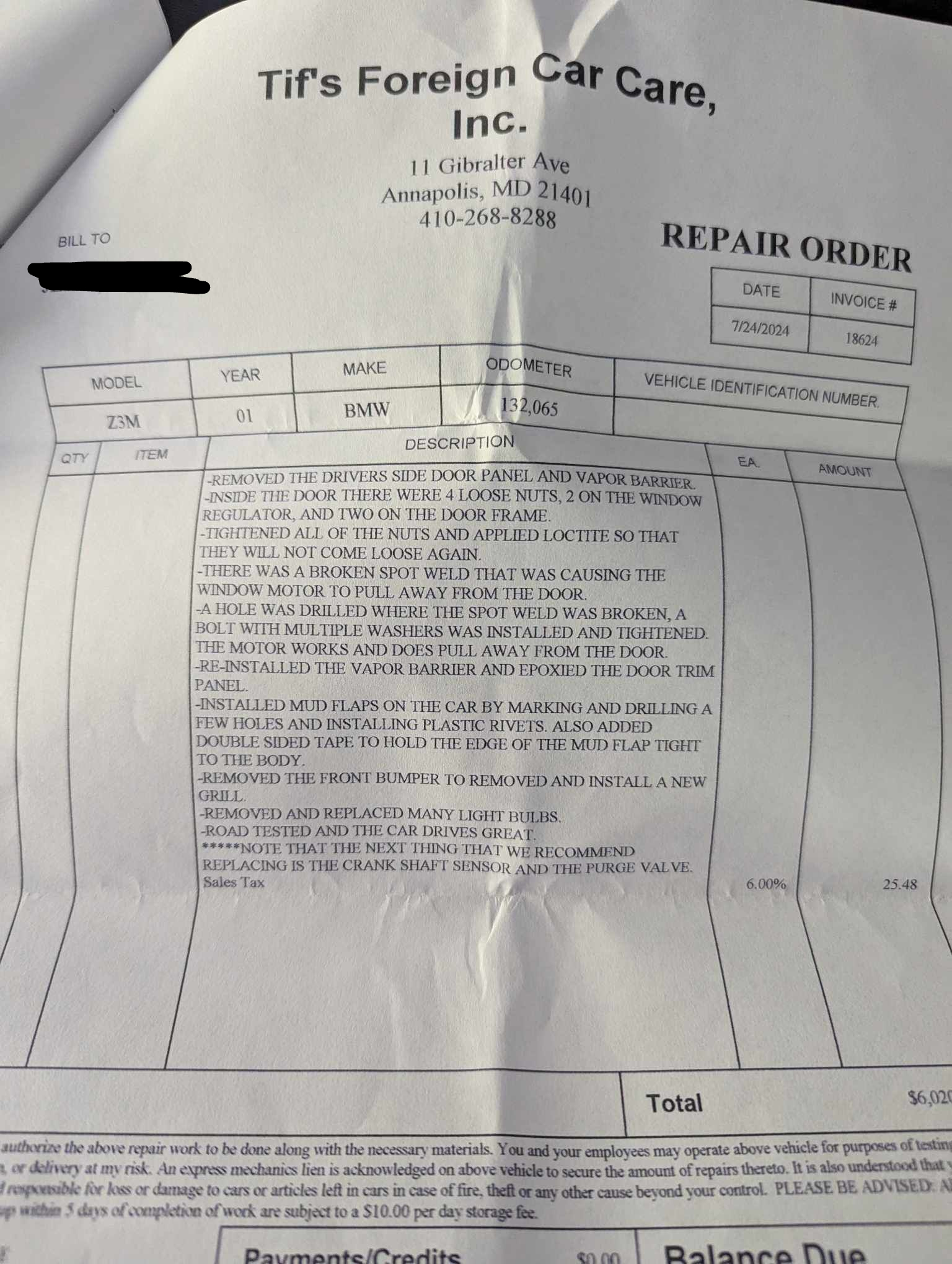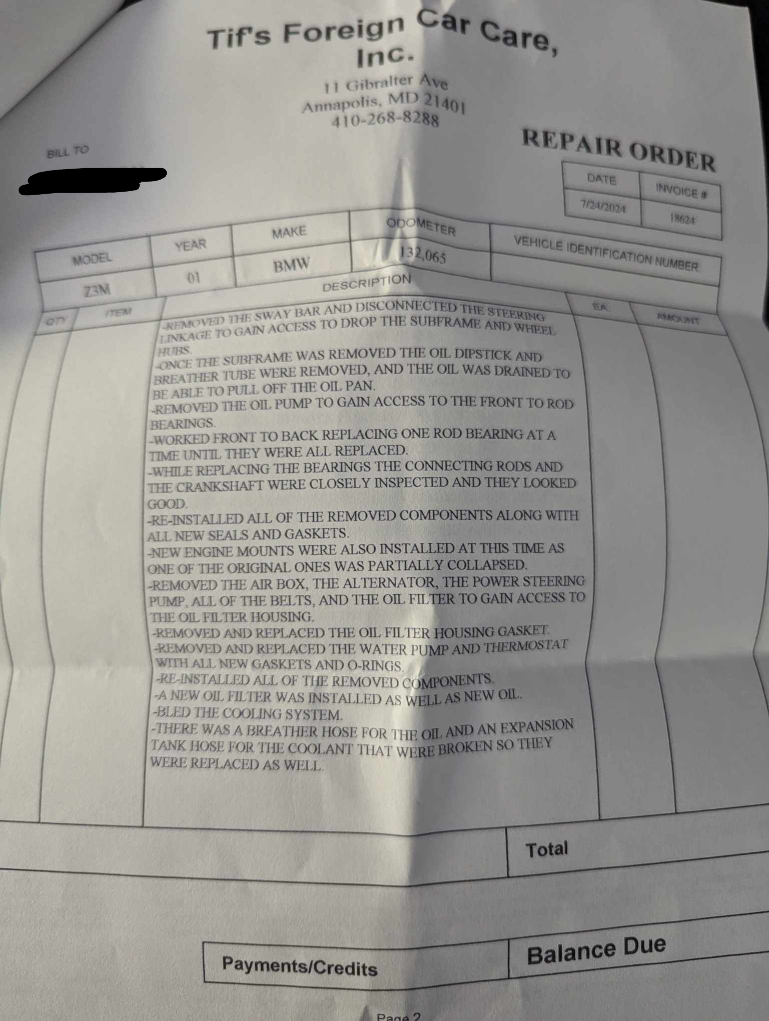 First major service for the M Coupe. Rod bearings were the big item, along with water pump, fluid changes, installing mudflaps, and other deferred maintenance items.