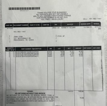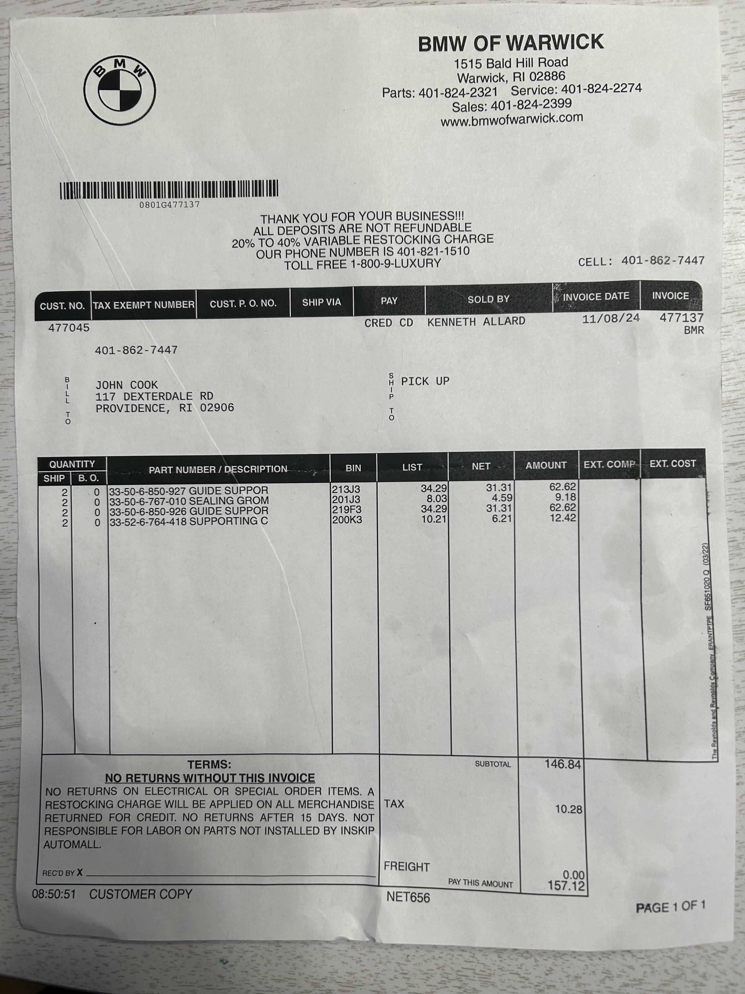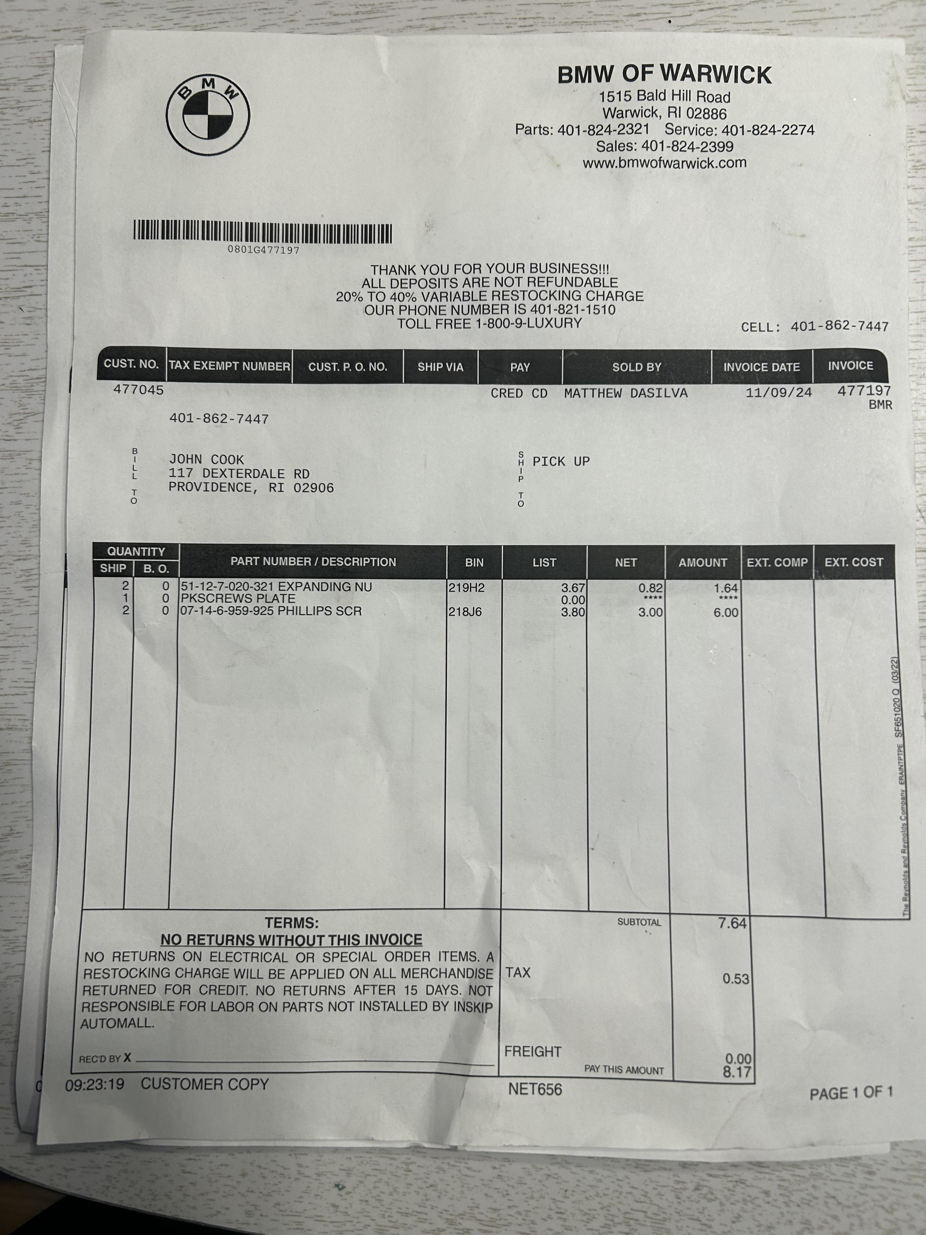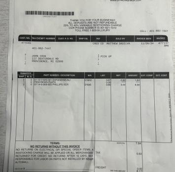 Vehicle 2014 BMW X1 Date 11/08/2024 Receipt(s) Image Description License plate mounting receivers and screws and rear upper shock mount bushing replacement