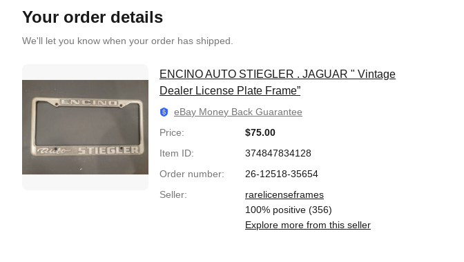 Vehicle 1992 Mercedes-Benz 500E Date 01/13/2025 Receipt(s) Image Description Original dealer plate frame