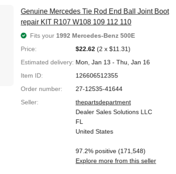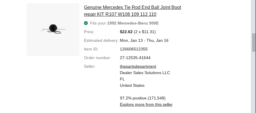 Vehicle 1992 Mercedes-Benz 500E Date 01/13/2025 Receipt(s) Image Description Ball joint repair kit to repair torn / leaking boots