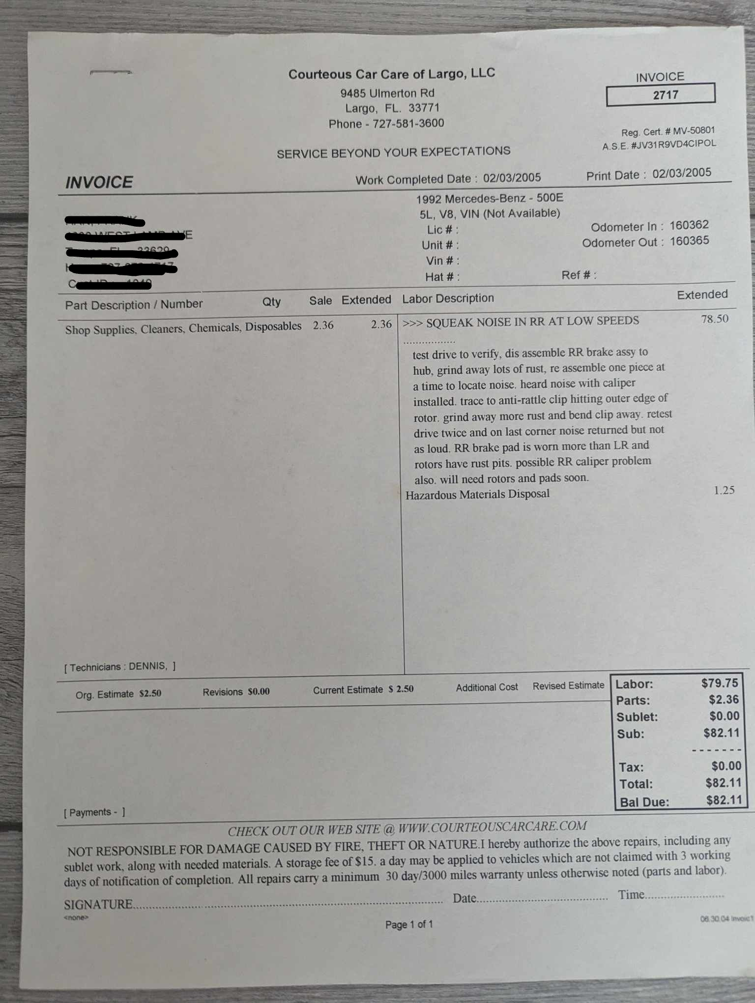 Vehicle 1992 Mercedes-Benz 500E Read more about 1992 Mercedes-Benz 500E Odometer 160,365 Maintenance Date 02/03/2005 Maintenance Summary Brake rotors cleaned of rust, anti-rattle clips replaced Maintenance Images