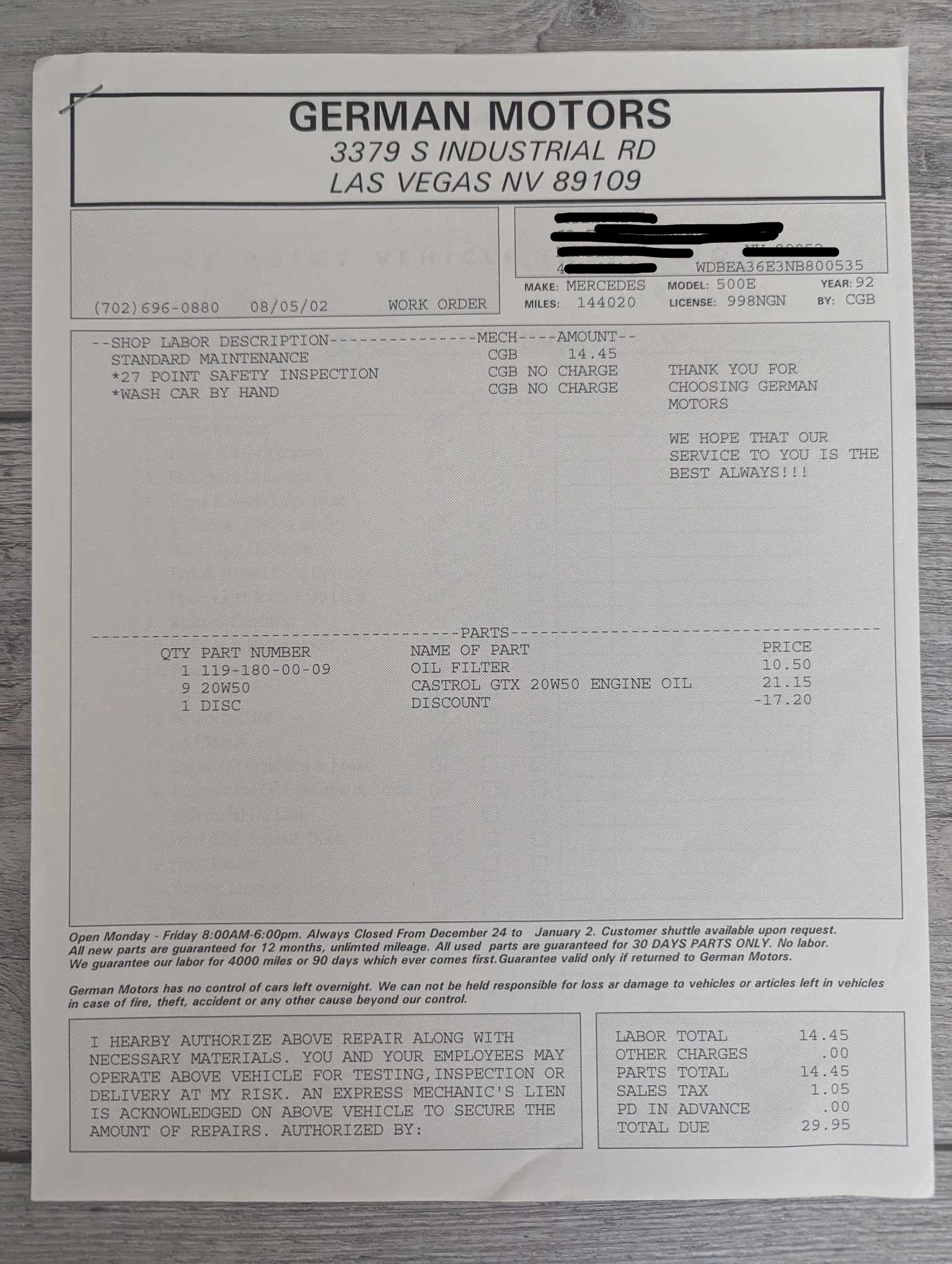 Vehicle 1992 Mercedes-Benz 500E Read more about 1992 Mercedes-Benz 500E Odometer 144,020 Maintenance Date 08/02/2005 Maintenance Summary Engine oil and filter change Maintenance Images