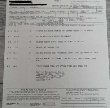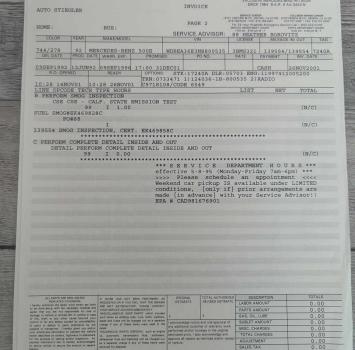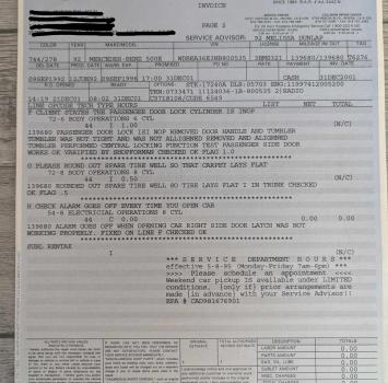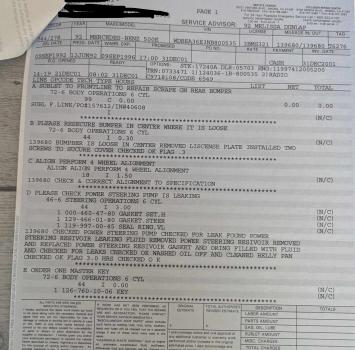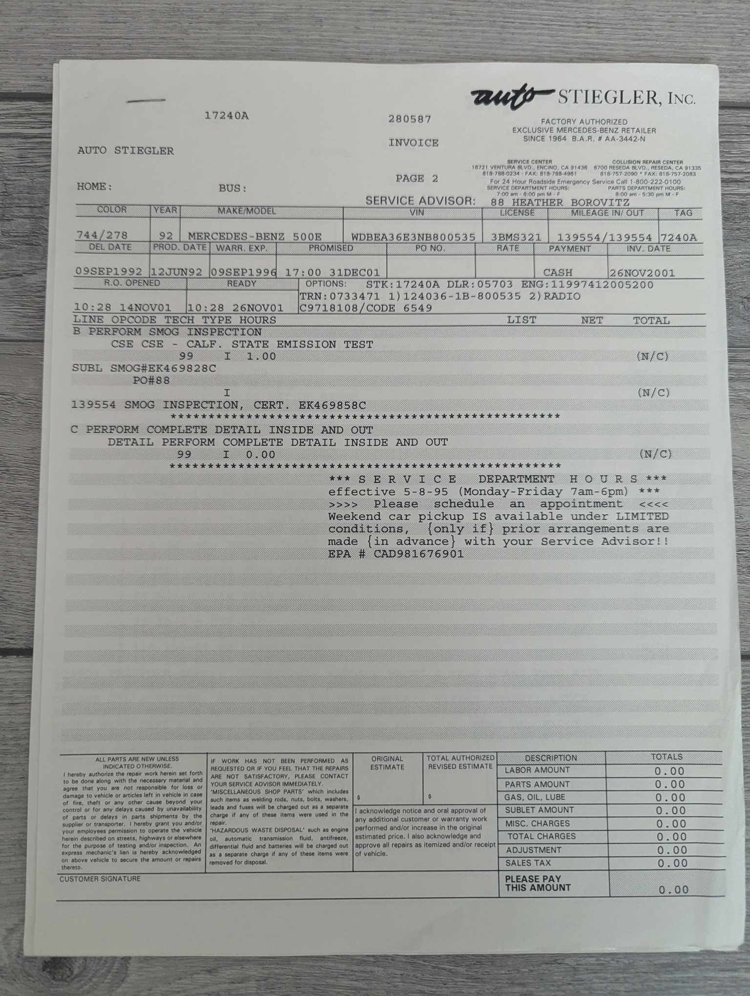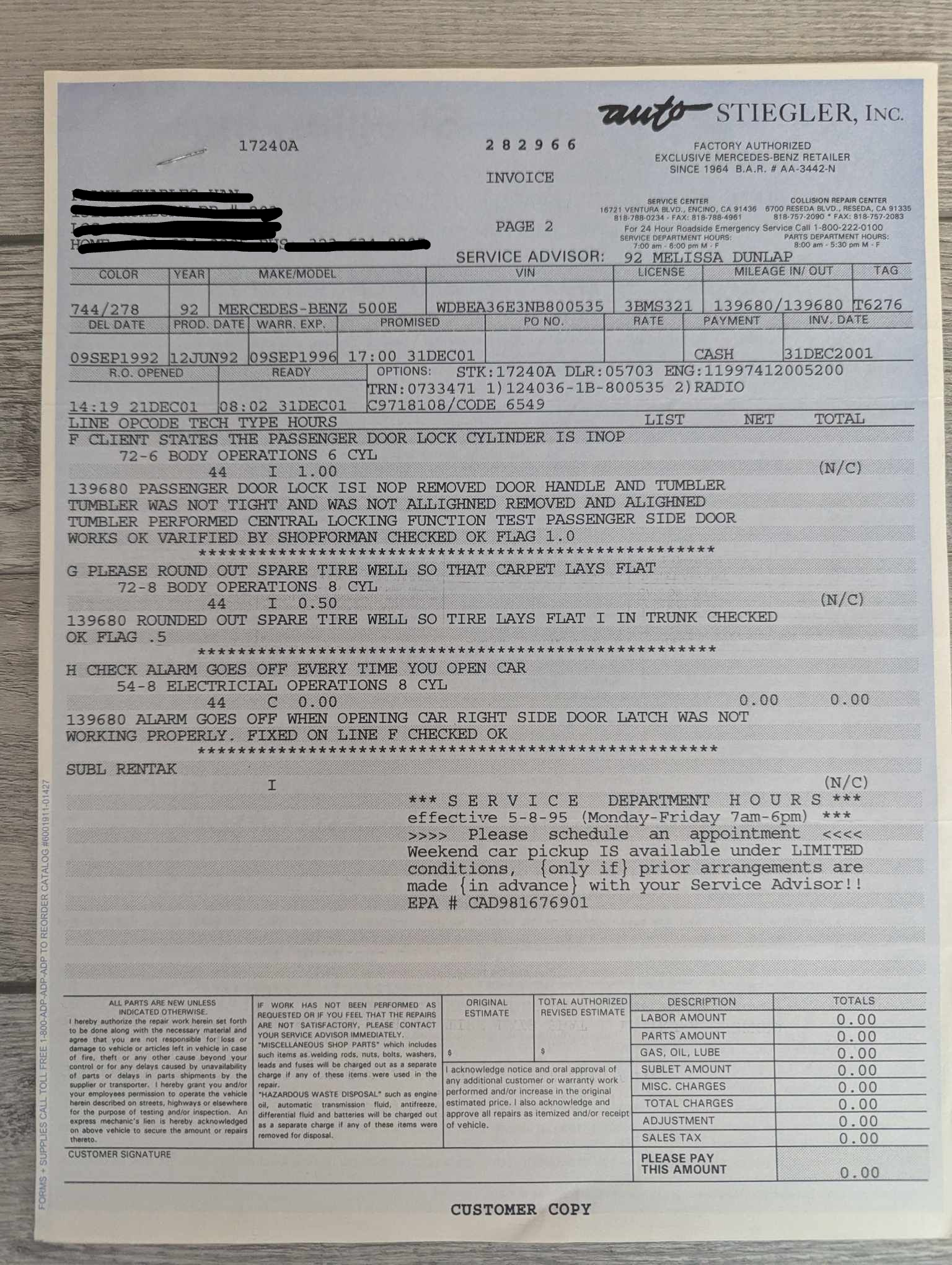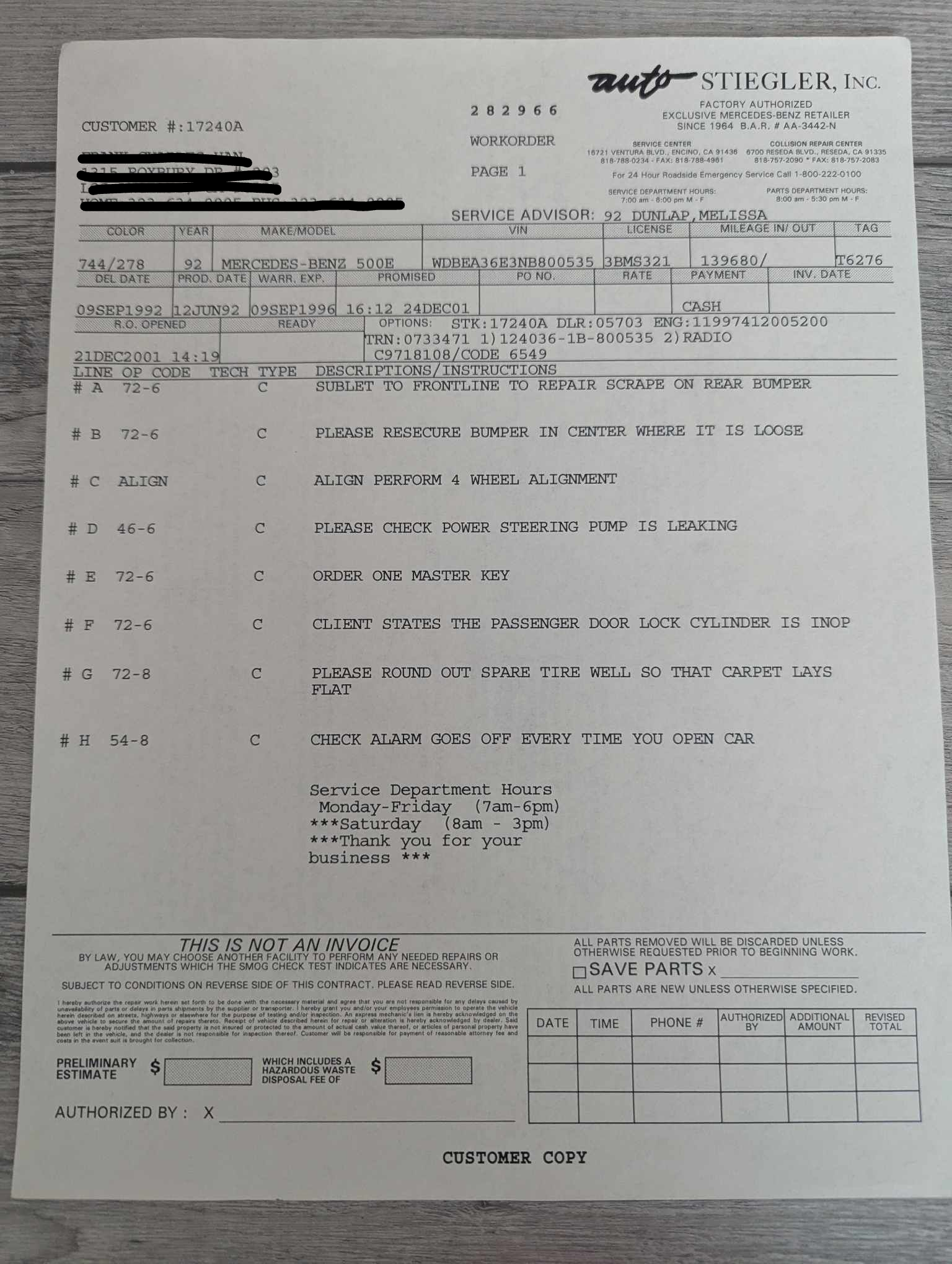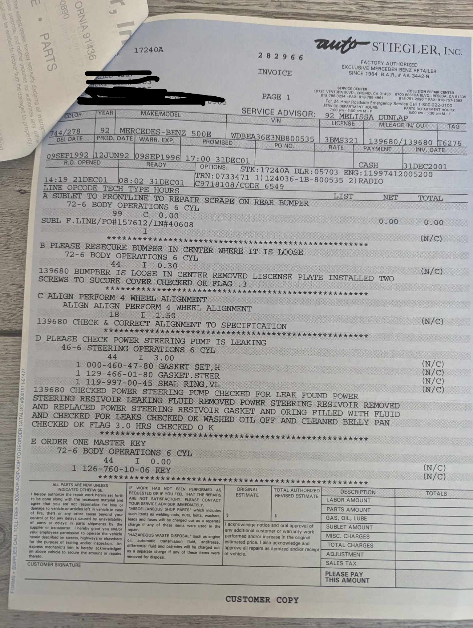 Previous owner brought the 500E in for a variety of bodywork adjustments. Not result of accident damage; just adjustments, mostly. The spare tire well was hammered out, and a four-wheel alignment was also performed. A power steering link was diagnosed.