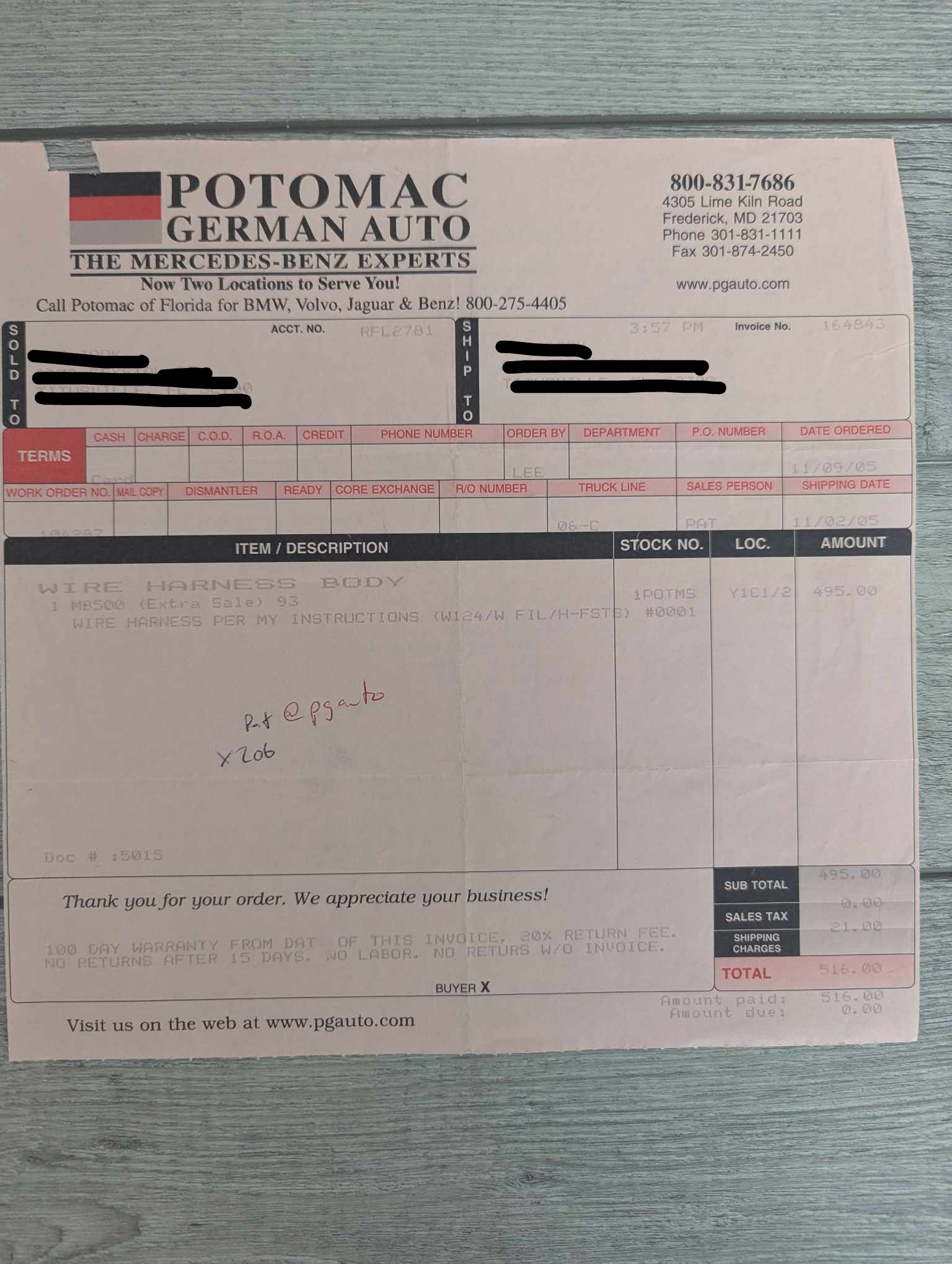 Vehicle 1992 Mercedes-Benz 500E Date 11/02/2005 Receipt(s) Image Description Must-do replacement for any W124. Main body harness replaced by previous owner.