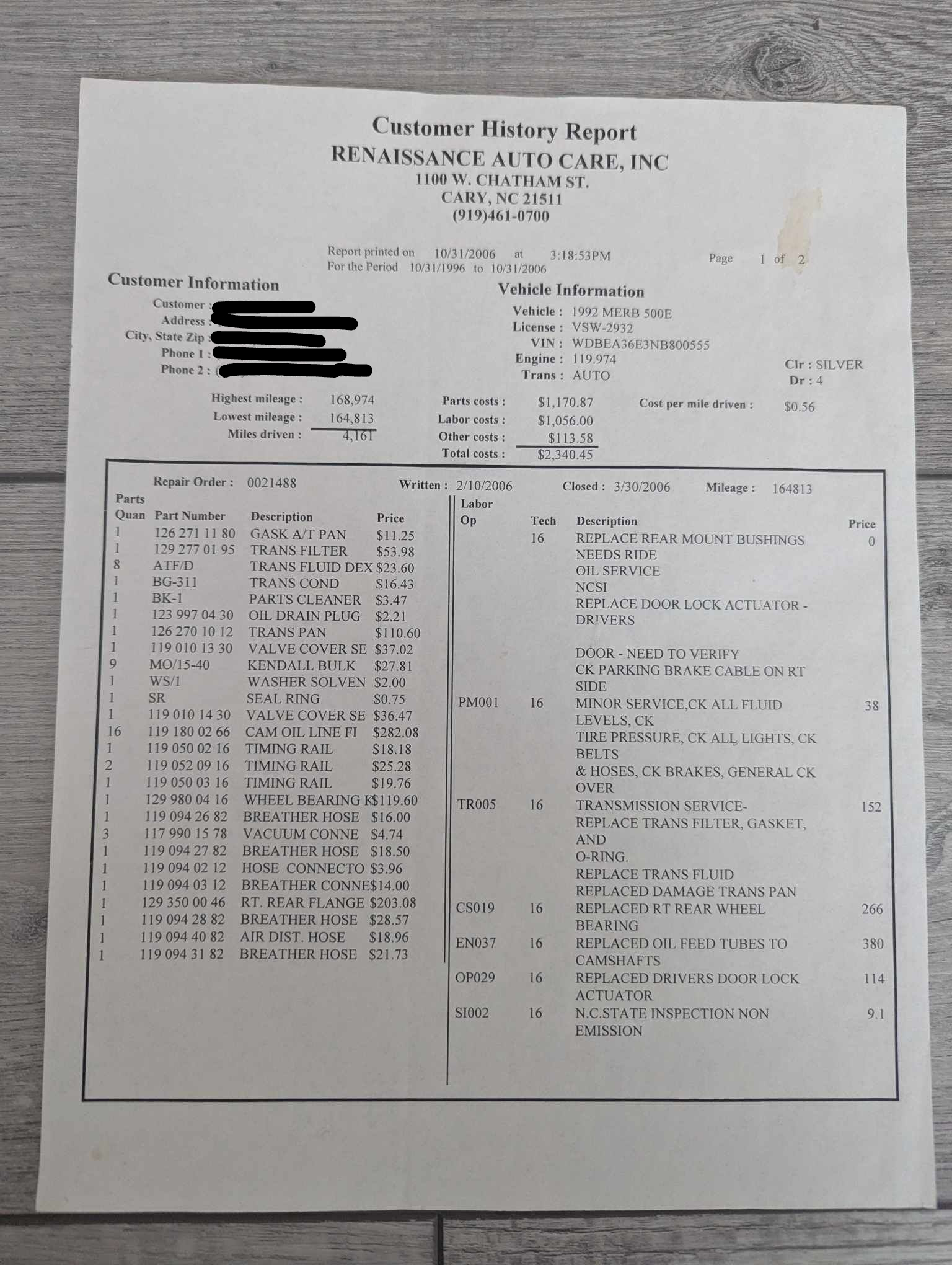 Vehicle 1992 Mercedes-Benz 500E Read more about 1992 Mercedes-Benz 500E Odometer 164,813 Maintenance Date 03/30/2006 Maintenance Summary Major transmission service along with rear wheel bearing replacement and oil feed tubes replacement. Maintenance Images