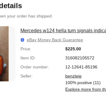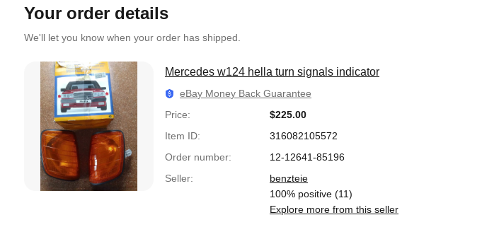 Vehicle 1992 Mercedes-Benz 500E Date 02/07/2025 Receipt(s) Image Description Dark amber Euro-spec turn signals