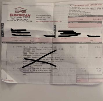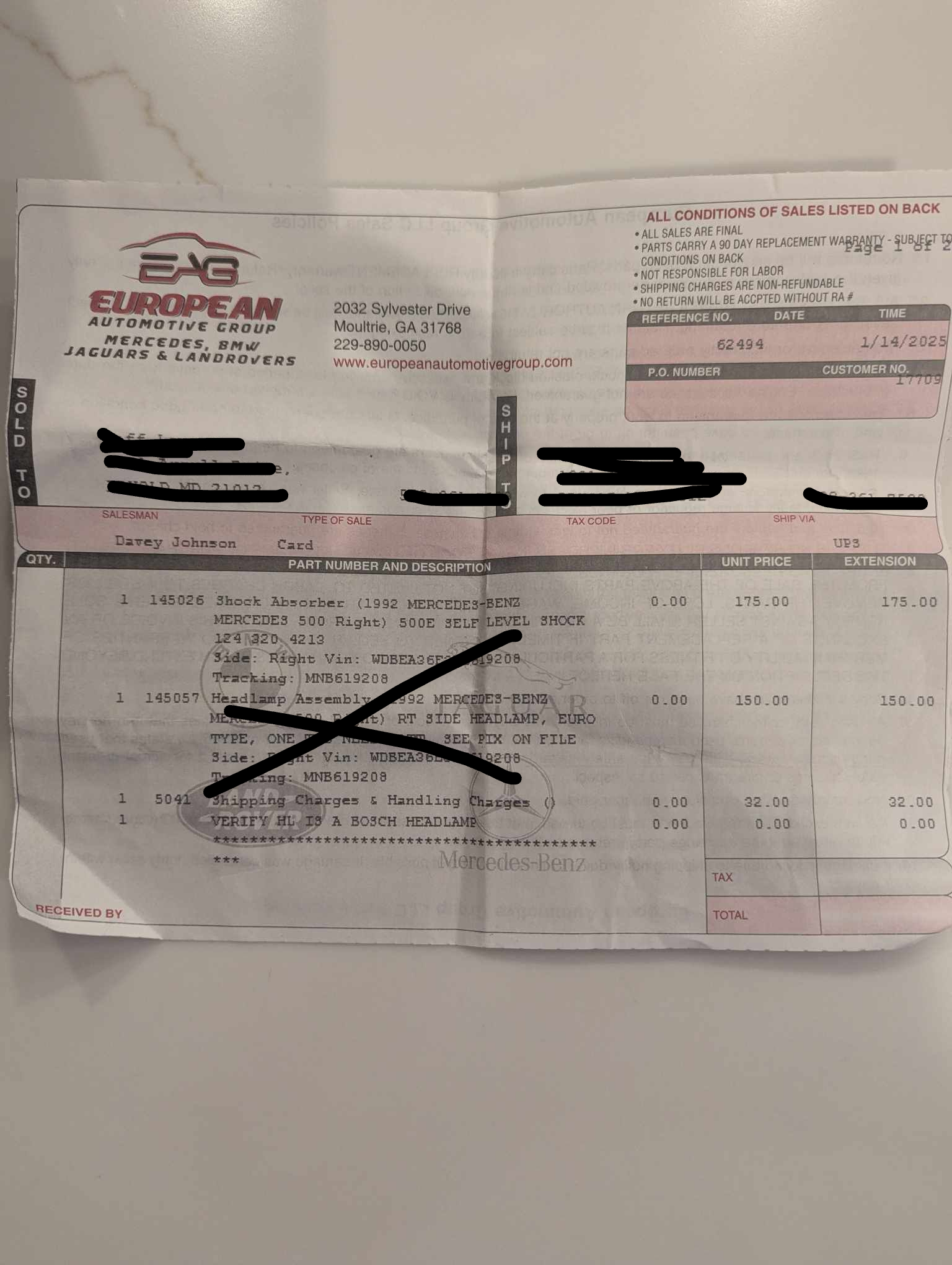 Vehicle 1992 Mercedes-Benz 500E Date 02/09/2025 Receipt(s) Image Description One used SLS shock. Hard to find part from low mileage car.