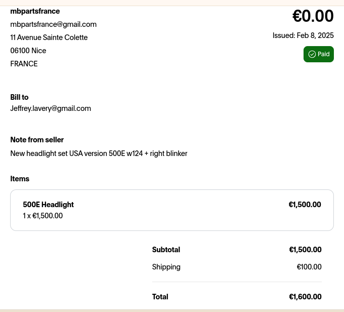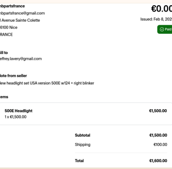 Vehicle 1992 Mercedes-Benz 500E Date 02/09/2025 Receipt(s) Image Description My 500E is missing its original headlights. This is a set of NOS US-spec headlamps.