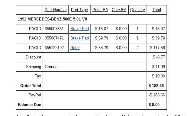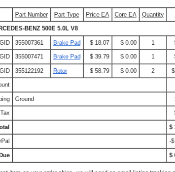 Vehicle 1992 Mercedes-Benz 500E Date 03/02/2025 Receipt(s) Image Description Brake pads for 500E. Ignore Pagid rotors, those were returned.