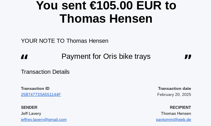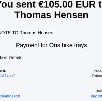 Vehicle 1992 Mercedes-Benz 500E Date 02/18/2025 Receipt(s) Image Description Paid Thomas to track down some Oris bike trays for the factory Oris racks.