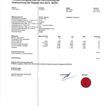 This document is an exhaust emissions inspection certificate for the Porsche 964, completed on August 12, 2008 at 69,988 km.