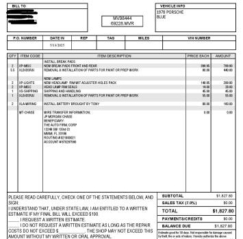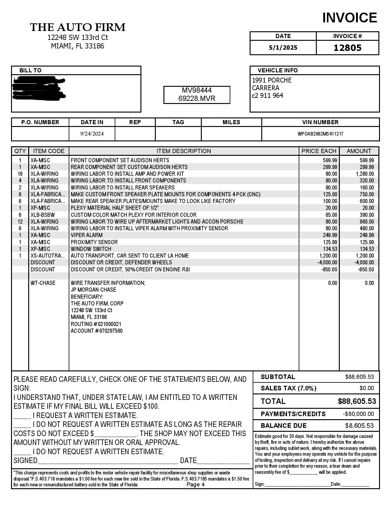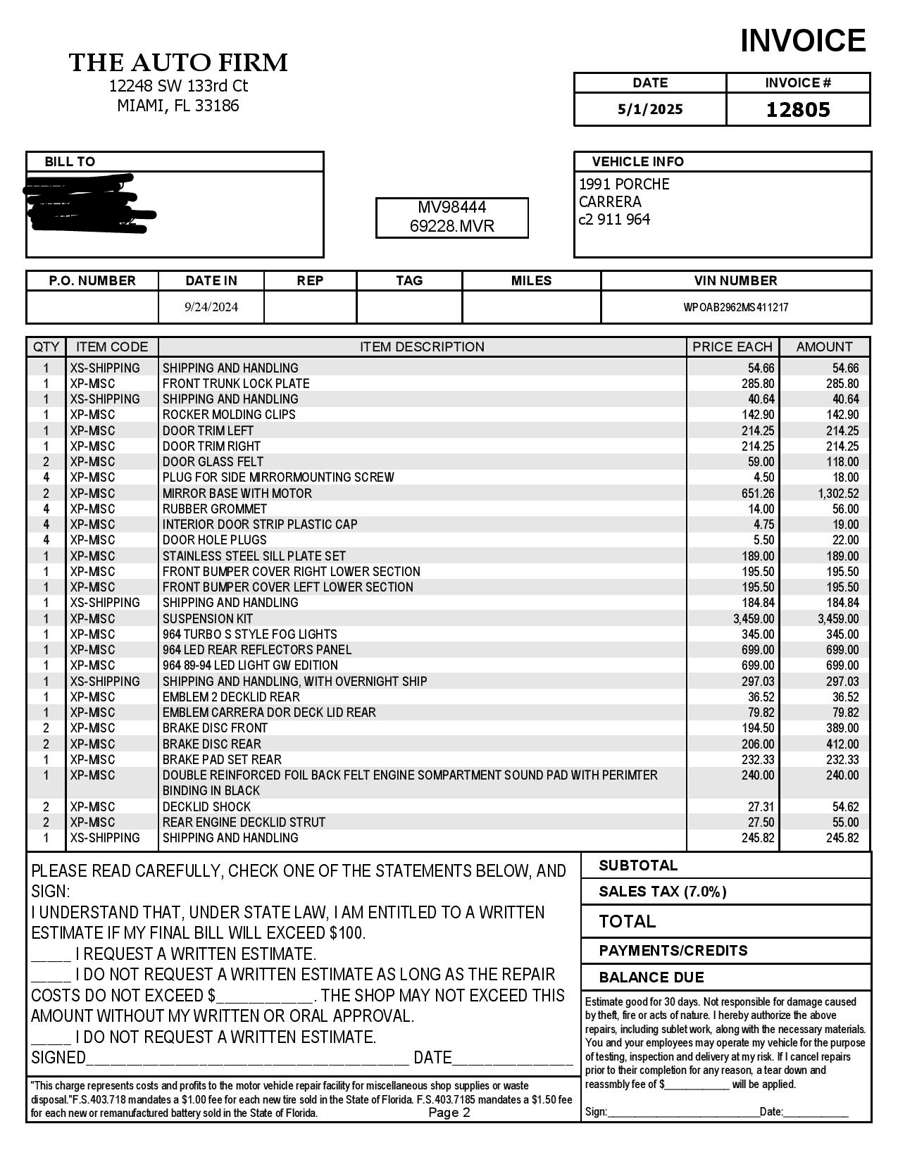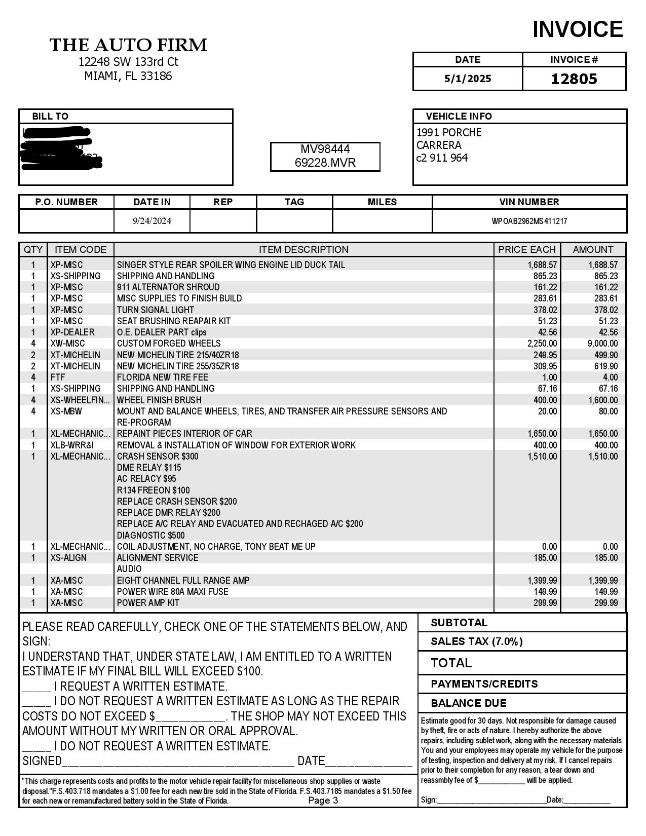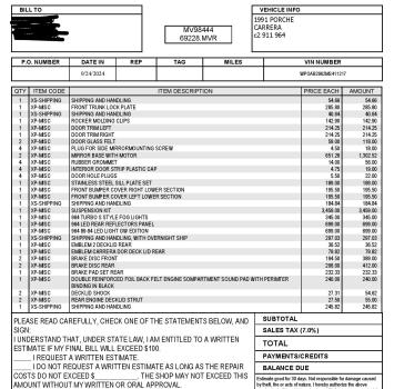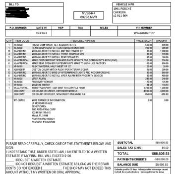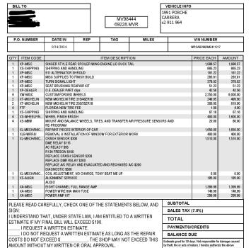 This is a comprehensive mechanical restoration and cosmetic upgrade project for a Porsche 964. Work included engine-out service, full suspension refresh, complete brake overhaul, leather re-trim, custom wheels/tires, upgraded audio/security system, and major paintwork. The invoice reflects both parts and labor, with many OEM and custom components.