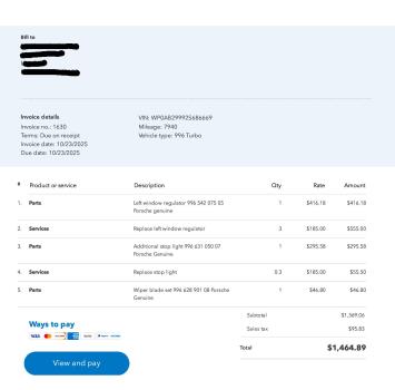 Vehicle 2002 Porsche 911 Turbo Aerokit Read more about 2002 Porsche 911 Turbo Aerokit Odometer 7,940 Maintenance Date 10/31/2025 Maintenance Summary Rear stop light and left window regulator replaced; wiper blades also replaced Maintenance Images