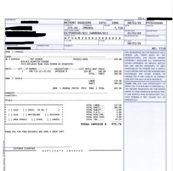 Vehicle 2002 Porsche 911 Turbo Aerokit Read more about 2002 Porsche 911 Turbo Aerokit Odometer 7,718 Maintenance Date 08/01/2025 Maintenance Summary Replacement of the rear view mirror Maintenance Images