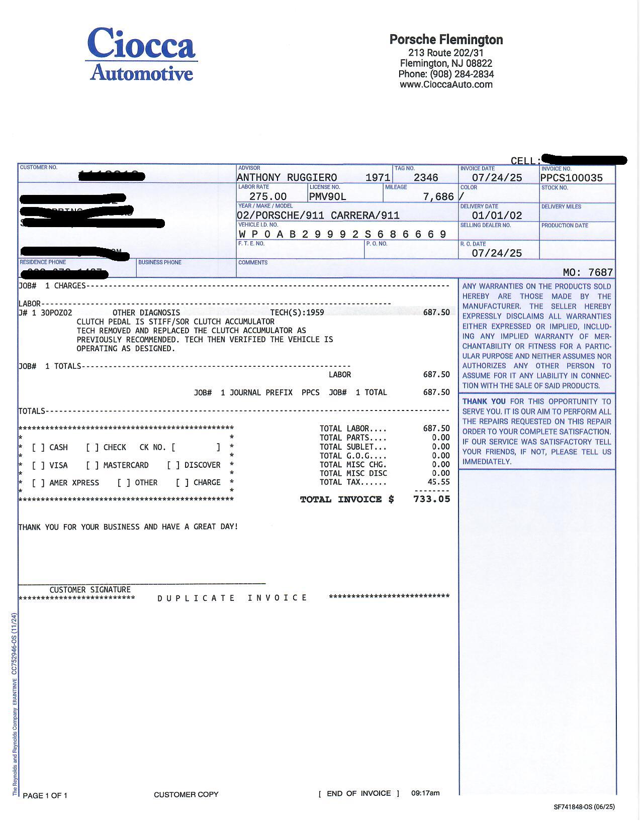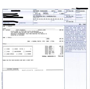 Vehicle 2002 Porsche 911 Turbo Aerokit Read more about 2002 Porsche 911 Turbo Aerokit Odometer 7,686 Maintenance Date 07/24/2025 Maintenance Summary Replacement of the clutch accumulator Maintenance Images