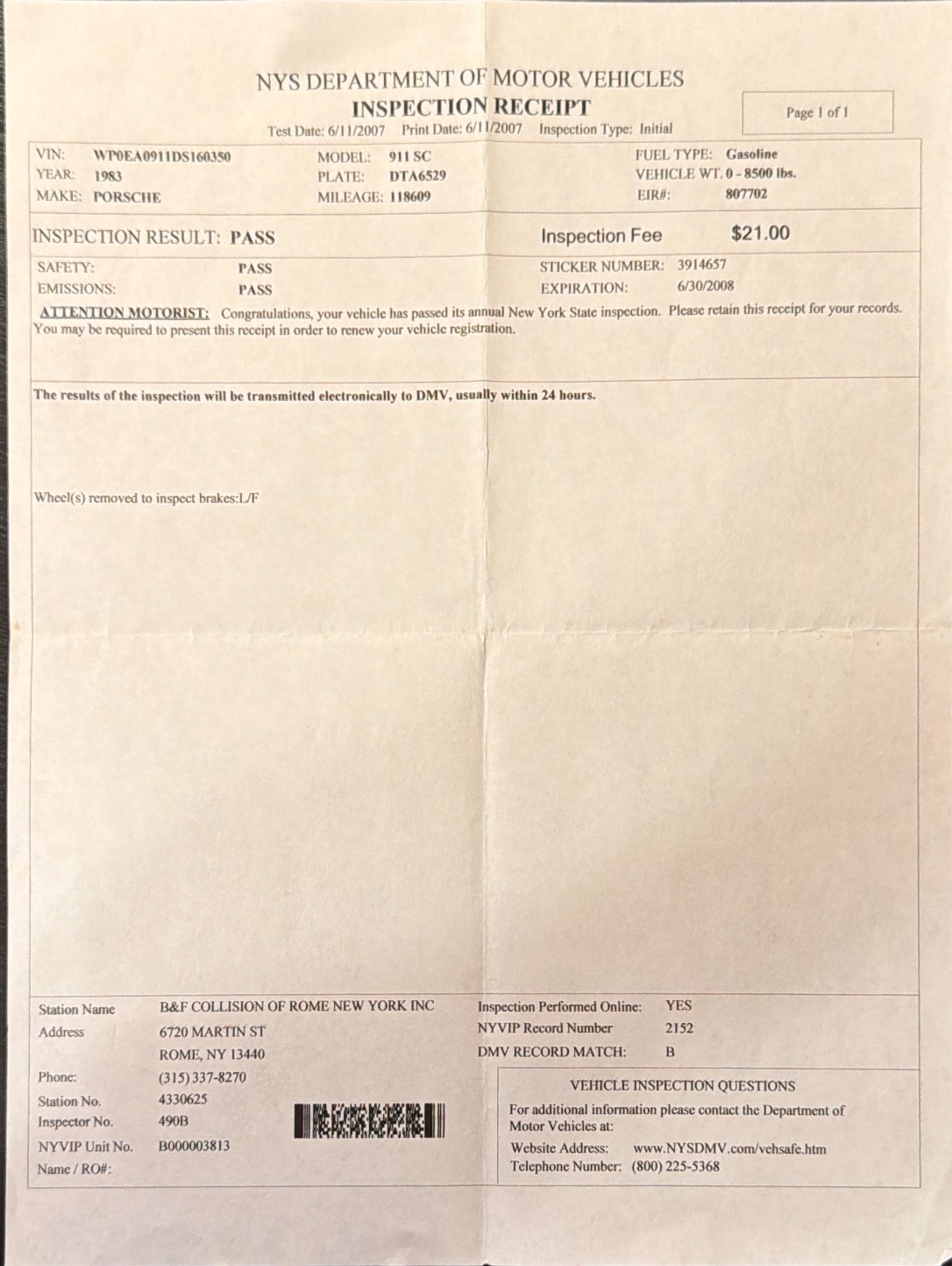 Vehicle Chiffon 911SC Read more about Chiffon 911SC Odometer 118,609 Maintenance Date 06/11/2007 Maintenance Summary NYSI Maintenance Images