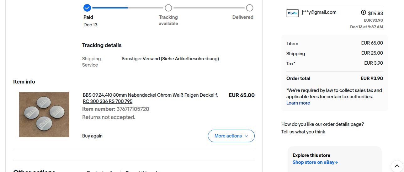 Vehicle 1992 Mercedes-Benz 500E Date 12/14/2025 Receipt(s) Image Description Original BBS center caps to install in the "waffle"-style covers.