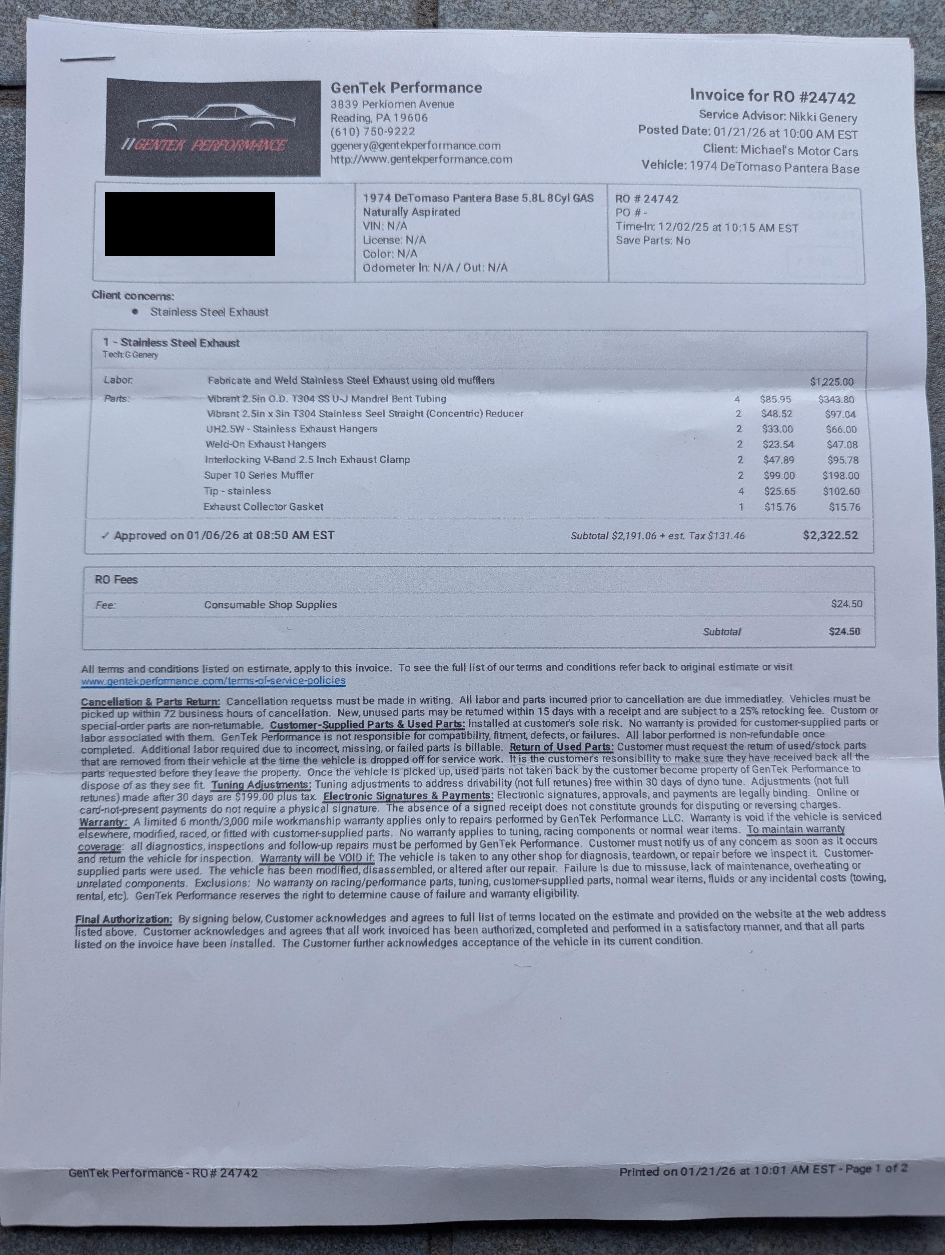 Vehicle 1974 De Tomaso Pantera Read more about 1974 De Tomaso Pantera Maintenance Date 12/02/2025 Maintenance Summary Fabrication of custom exhaust using factory and replacement components. Maintenance Images