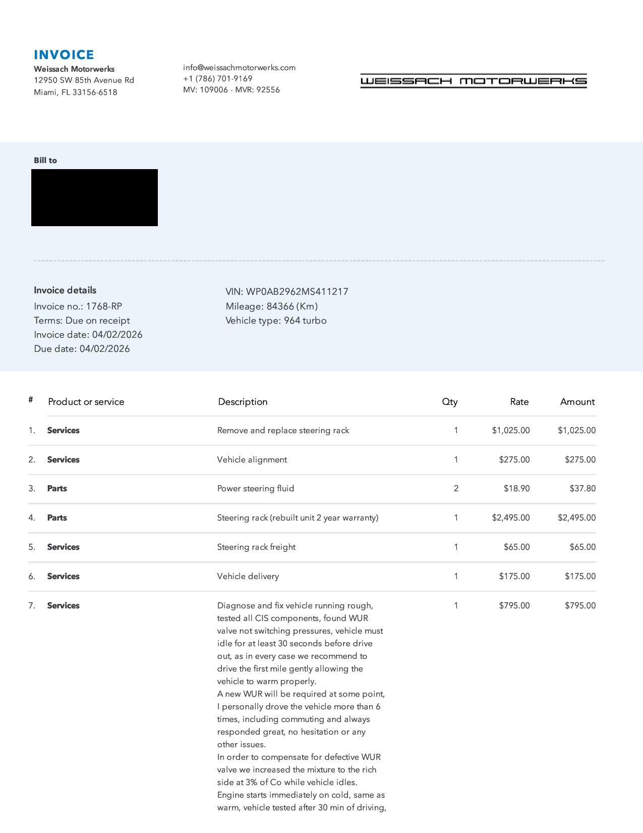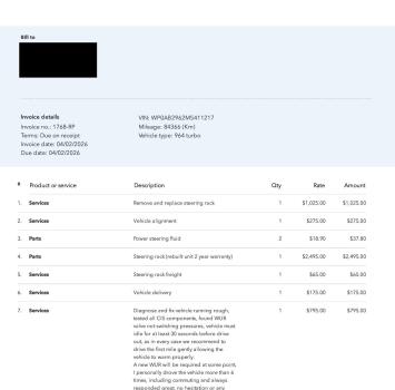Vehicle BAD BOY 964 TURBO Read more about BAD BOY 964 TURBO Odometer 52,422 Maintenance Date 04/02/2026 Maintenance Summary Steering rack replaced; power steering fluid flushed; four wheel alignment performed Maintenance Images