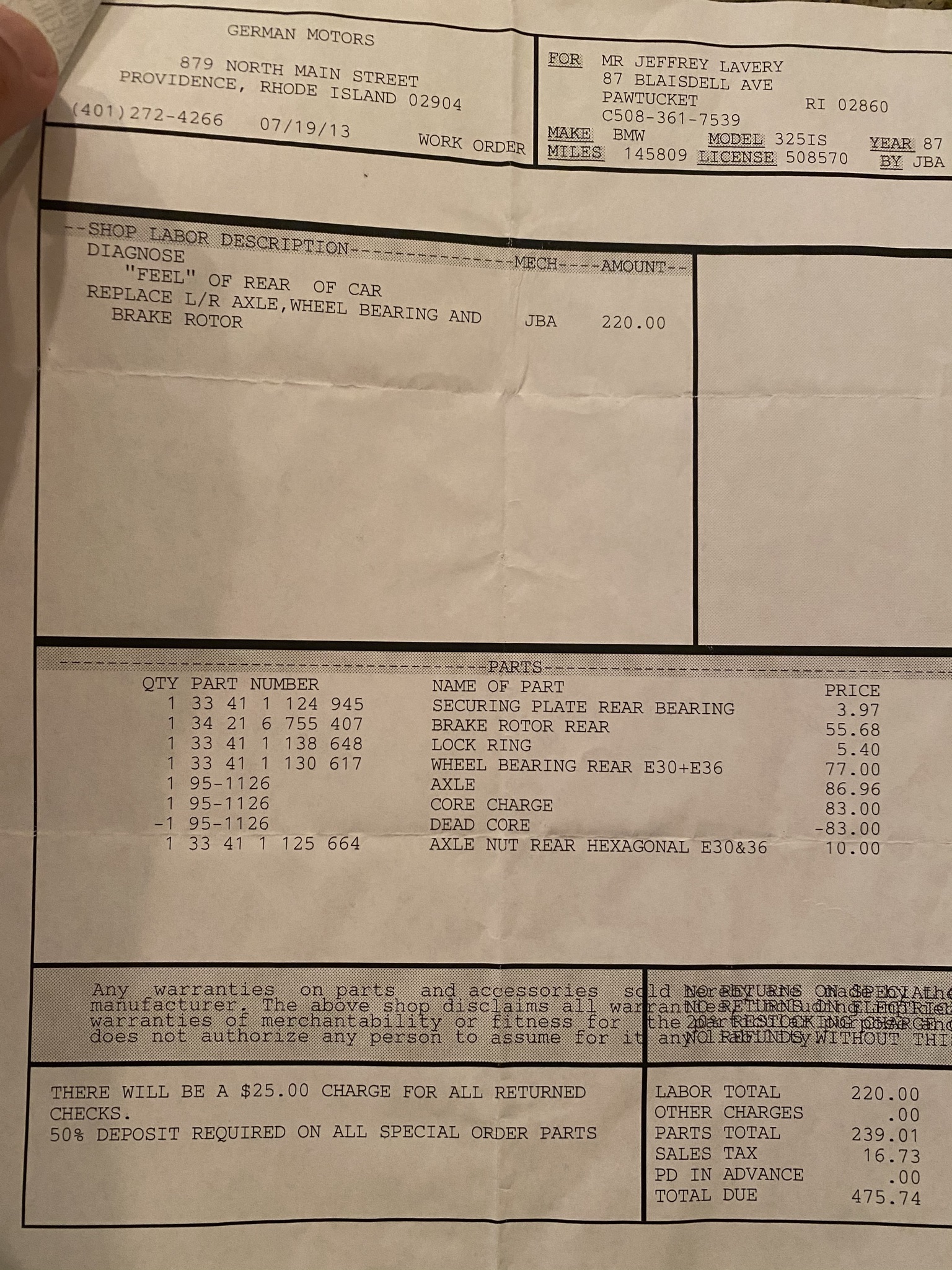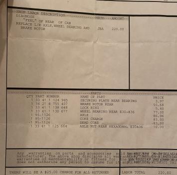 At the time, I noticed the car felt loose and generally unsettled in turns. The diagnosis work confirmed that the left rear axle was fairly chewed up, requiring a new axle, wheel bearing, and replacement rotor.