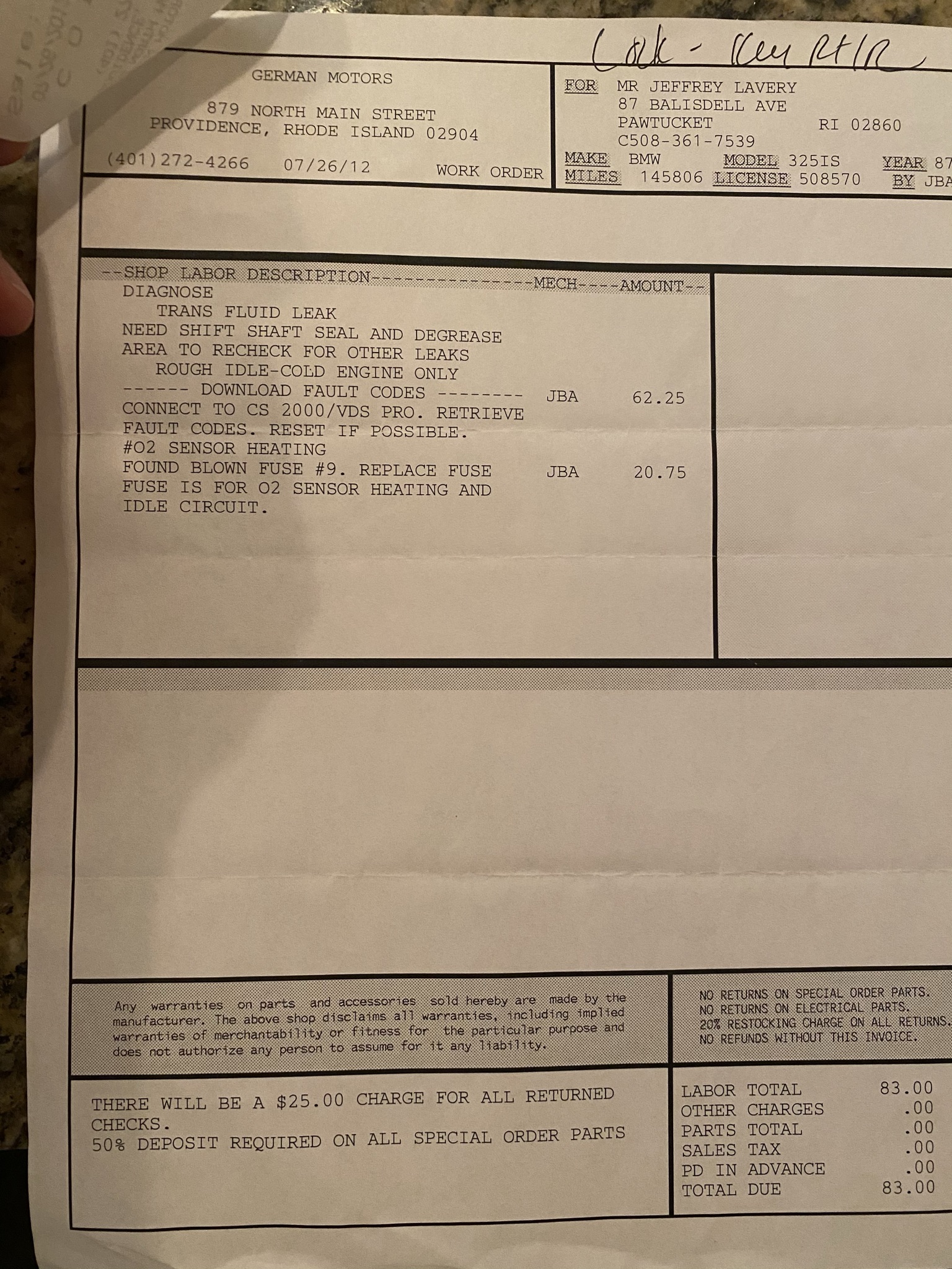 Vehicle 1987 BMW 325is Read more about 1987 BMW 325is Odometer 145,806 Maintenance Date 07/26/2012 Maintenance Summary This repair was to address a lingering transmission fluid leak that was traced back to the shift seal. Maintenance Images