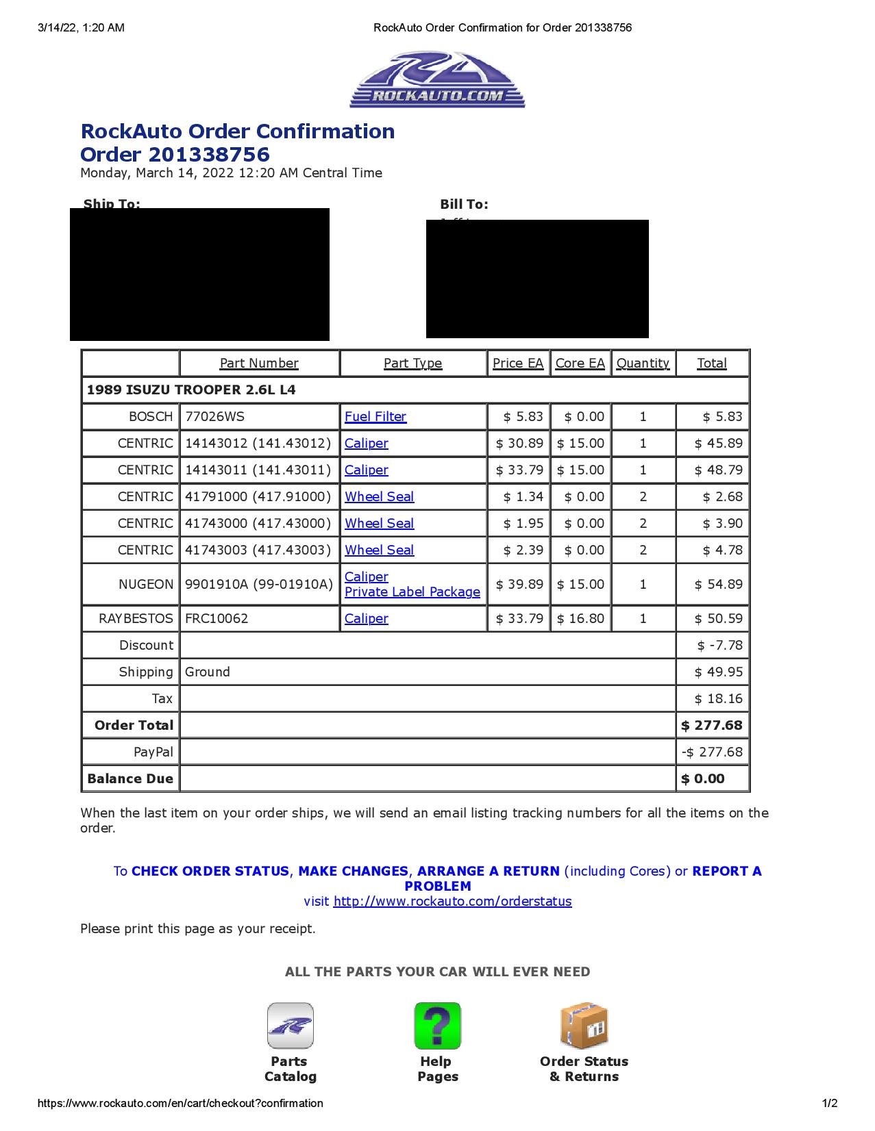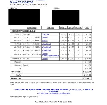 Vehicle 1989 Isuzu Trooper RS Date 03/14/2022 Receipt(s) Image Cost $277.68 Description Rebuilt calipers; new wheel seals; new fuel filter