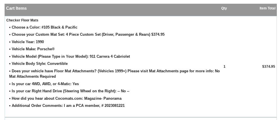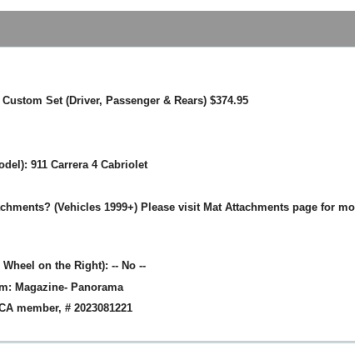 Vehicle 1990 Porsche 911 C4 Cabriolet Date 10/17/2025 Receipt(s) Image Description 4 piece Coco mat set for 964