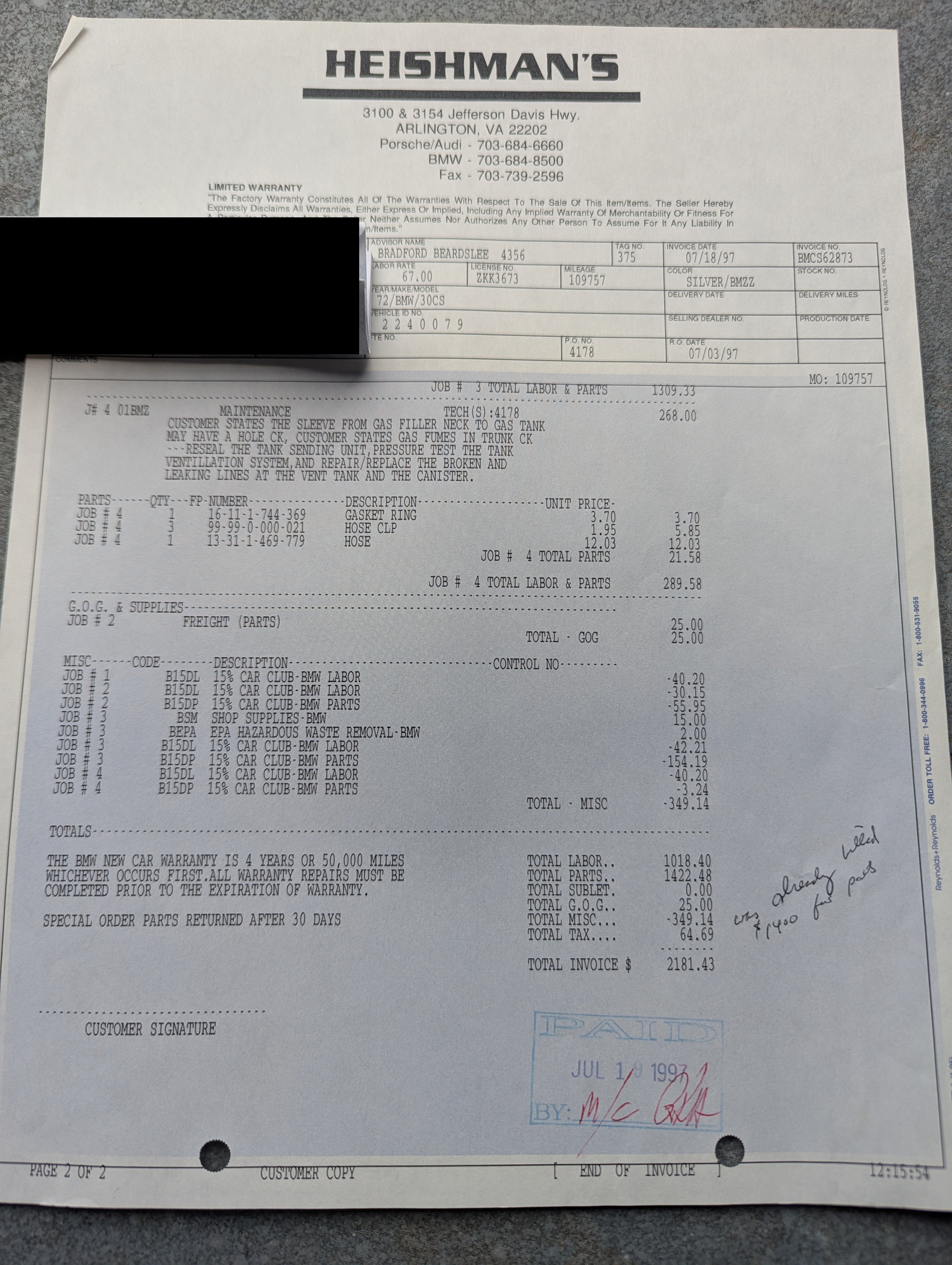 Vehicle 1972 BMW 3.0 CS Coupe Read more about 1972 BMW 3.0 CS Coupe Odometer 109,757 Maintenance Date 07/18/1997 Maintenance Summary The gas tank ventilation system was repaired with new lines at the vent tank and canister. Maintenance Images