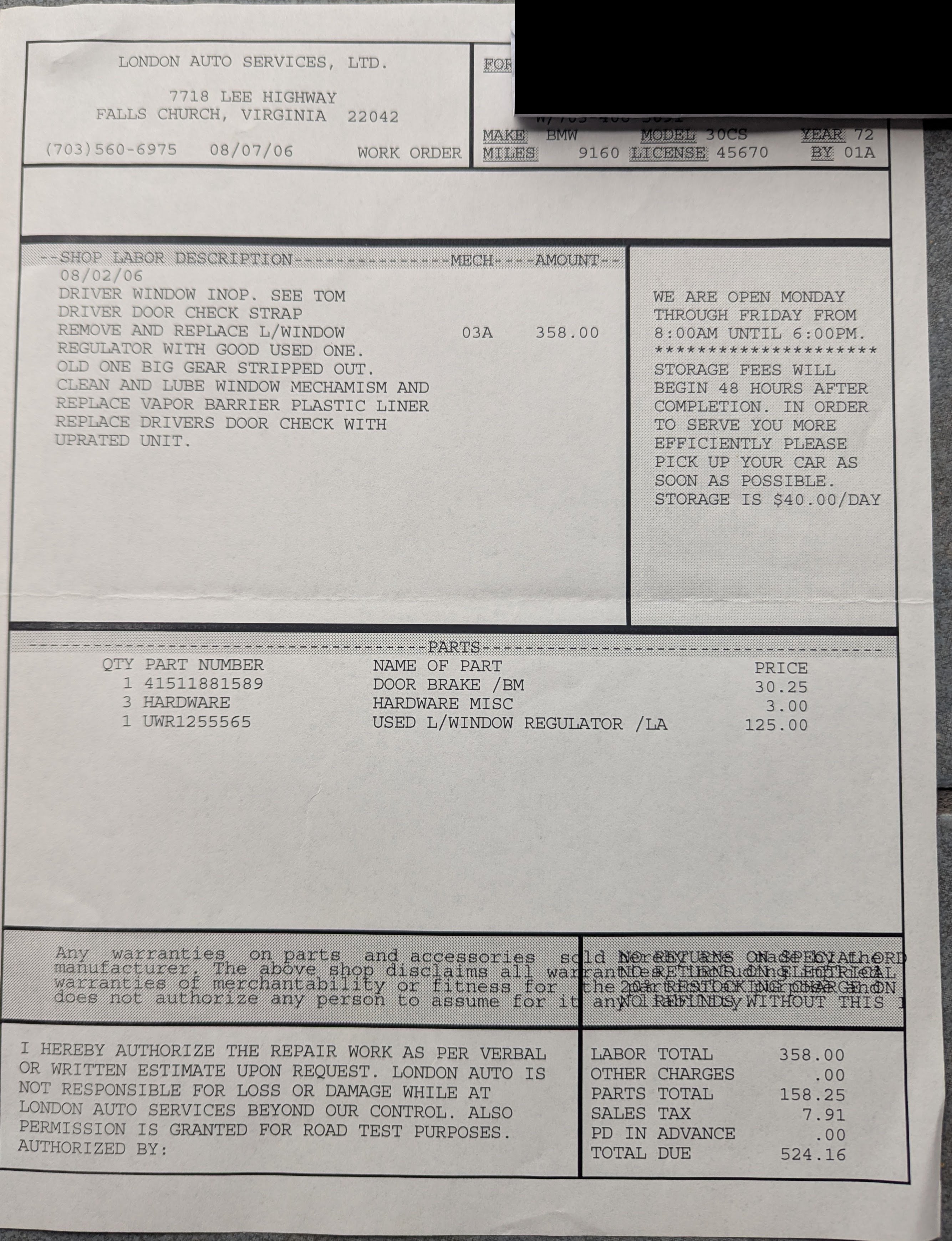 Vehicle 1972 BMW 3.0 CS Coupe Read more about 1972 BMW 3.0 CS Coupe Maintenance Date 08/07/2006 Maintenance Summary The driver's door window regulator was replaced. Maintenance Images