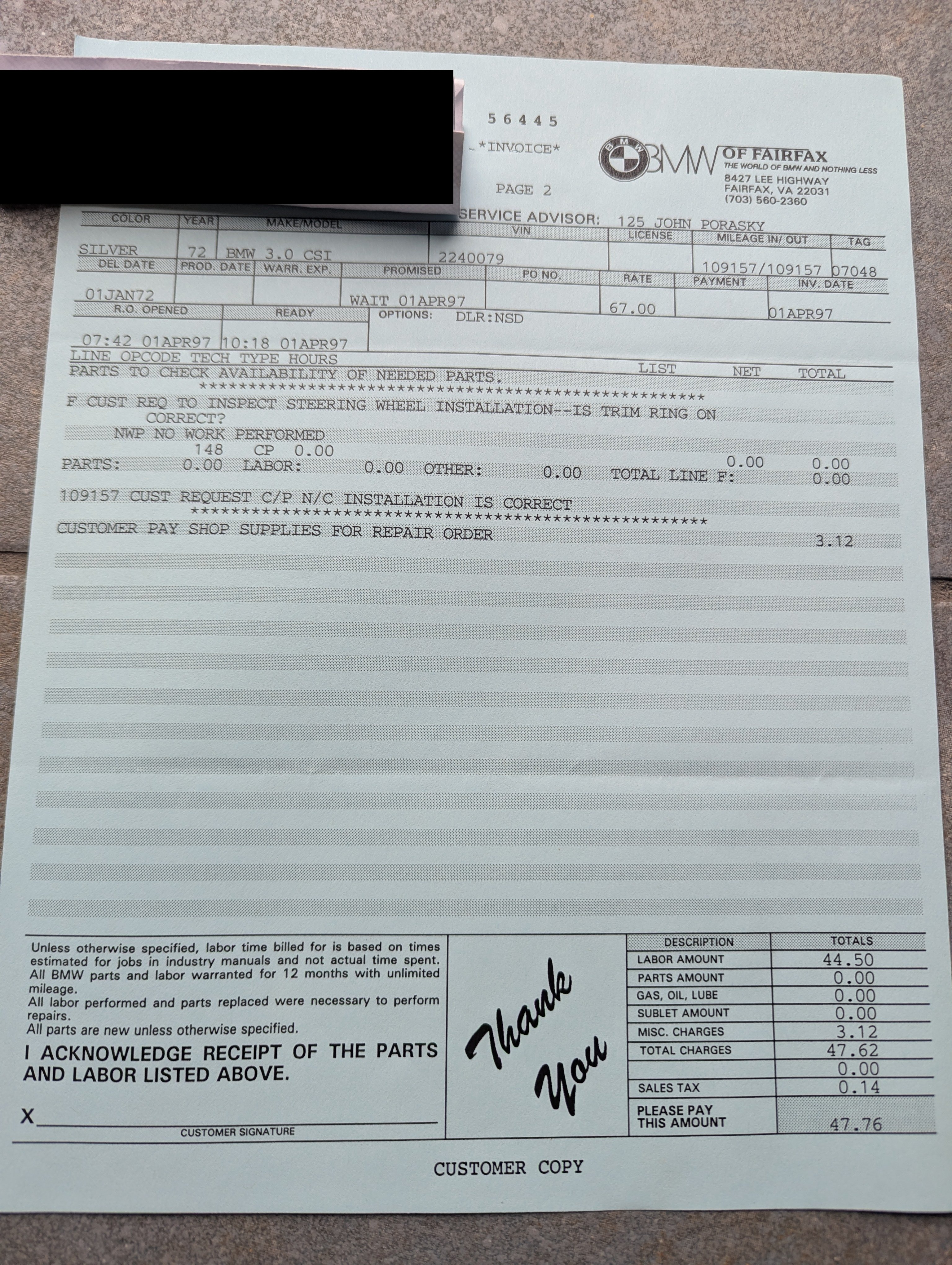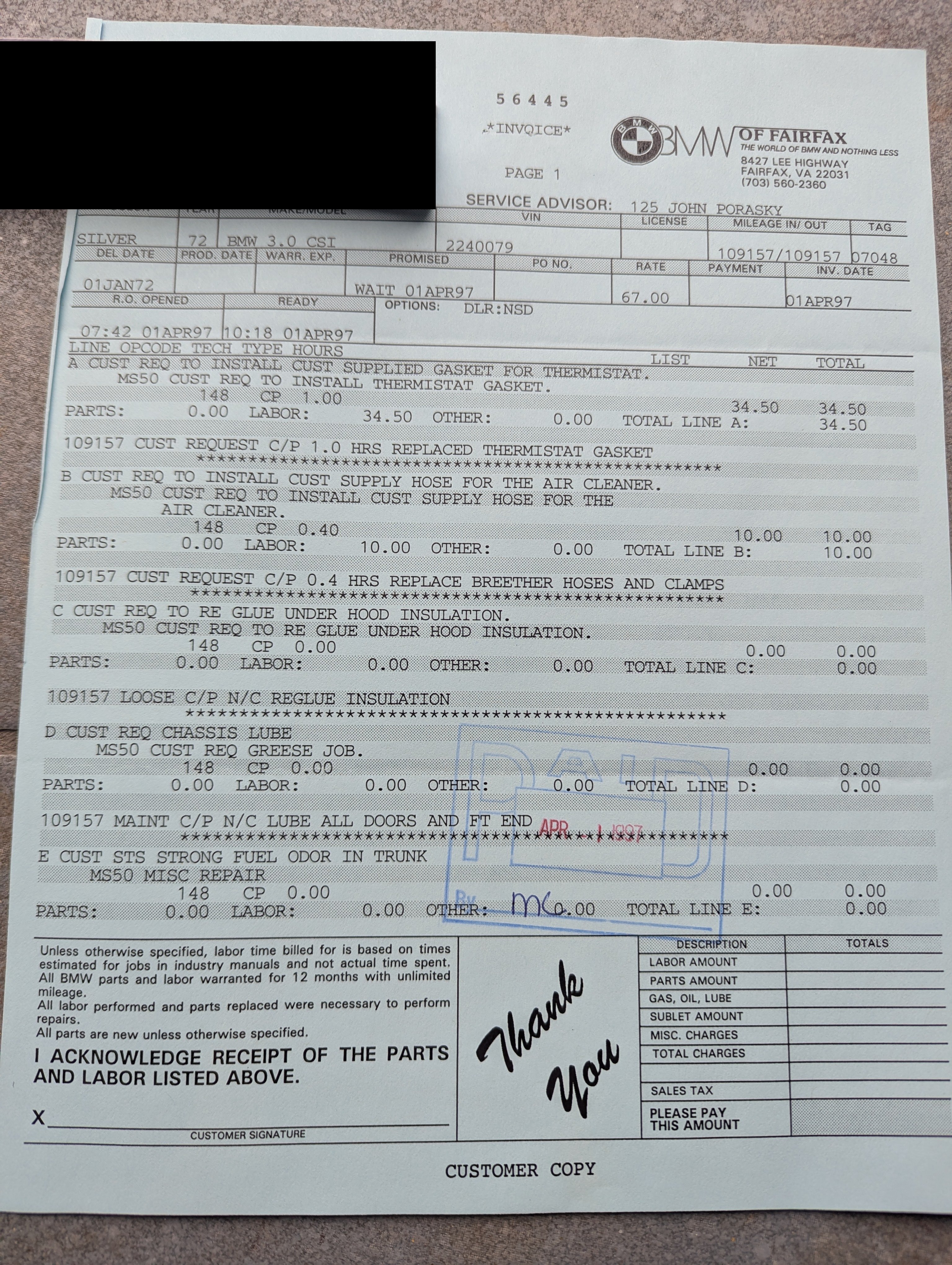 Vehicle 1972 BMW 3.0 CS Coupe Read more about 1972 BMW 3.0 CS Coupe Maintenance Date 04/01/1997 Maintenance Summary The customer provided a replacement thermostat gasket and air intake supply hoses for replacement; the chassis was also lubricated at this time. Maintenance Images