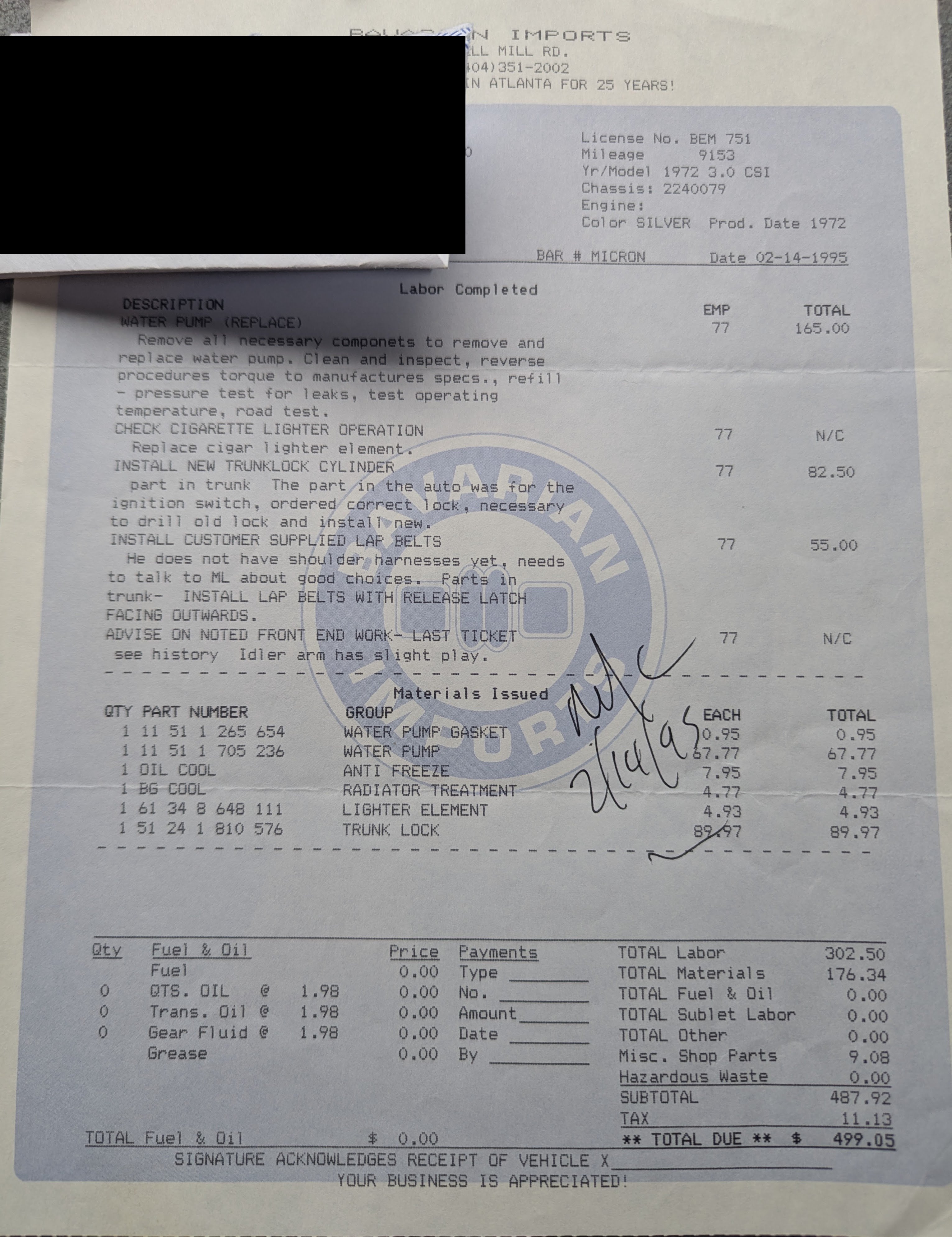 Vehicle 1972 BMW 3.0 CS Coupe Read more about 1972 BMW 3.0 CS Coupe Maintenance Date 02/14/1995 Maintenance Summary The water pump and trunk lock cylinder were replaced, and a set of aftermarket lap belts installed. Maintenance Images