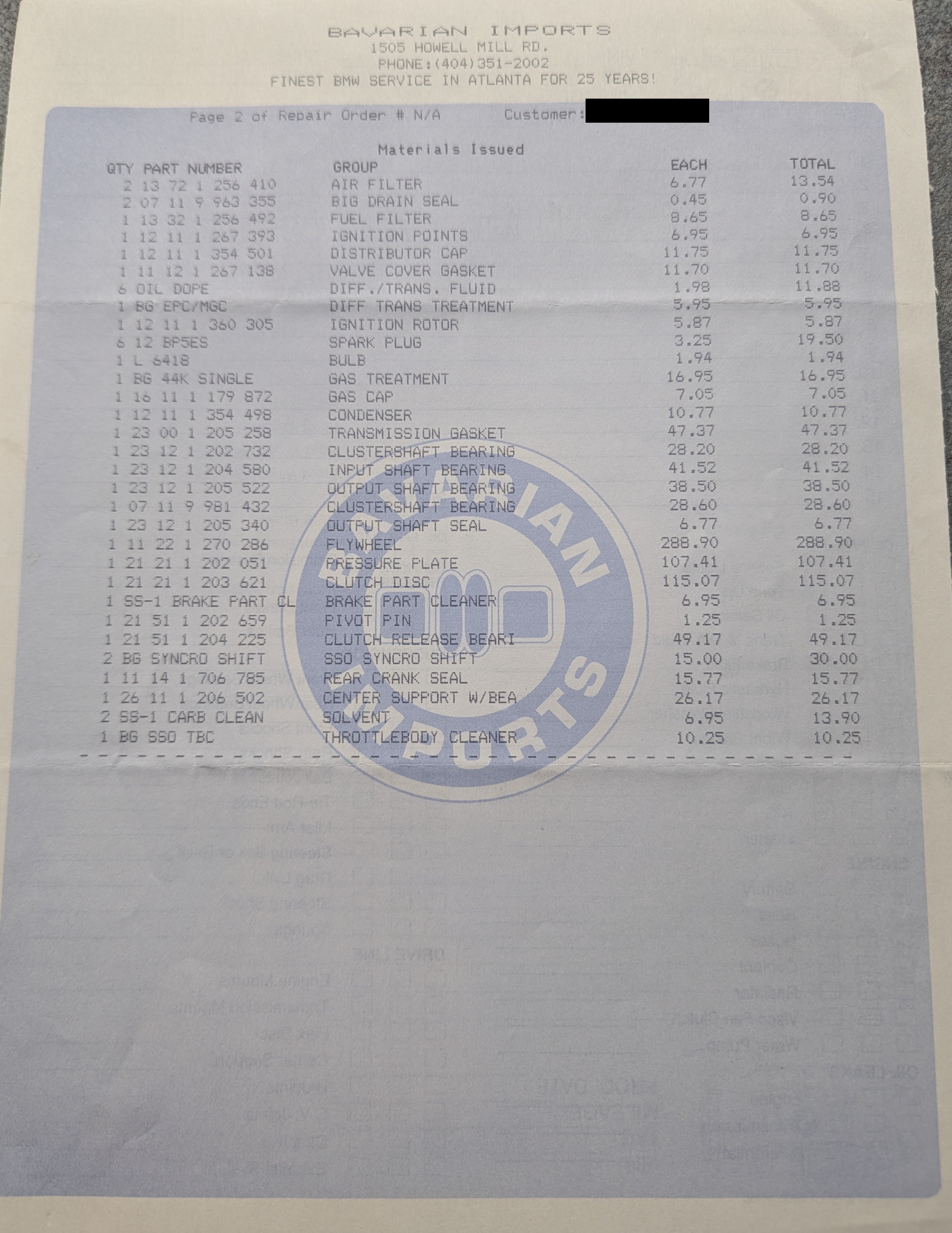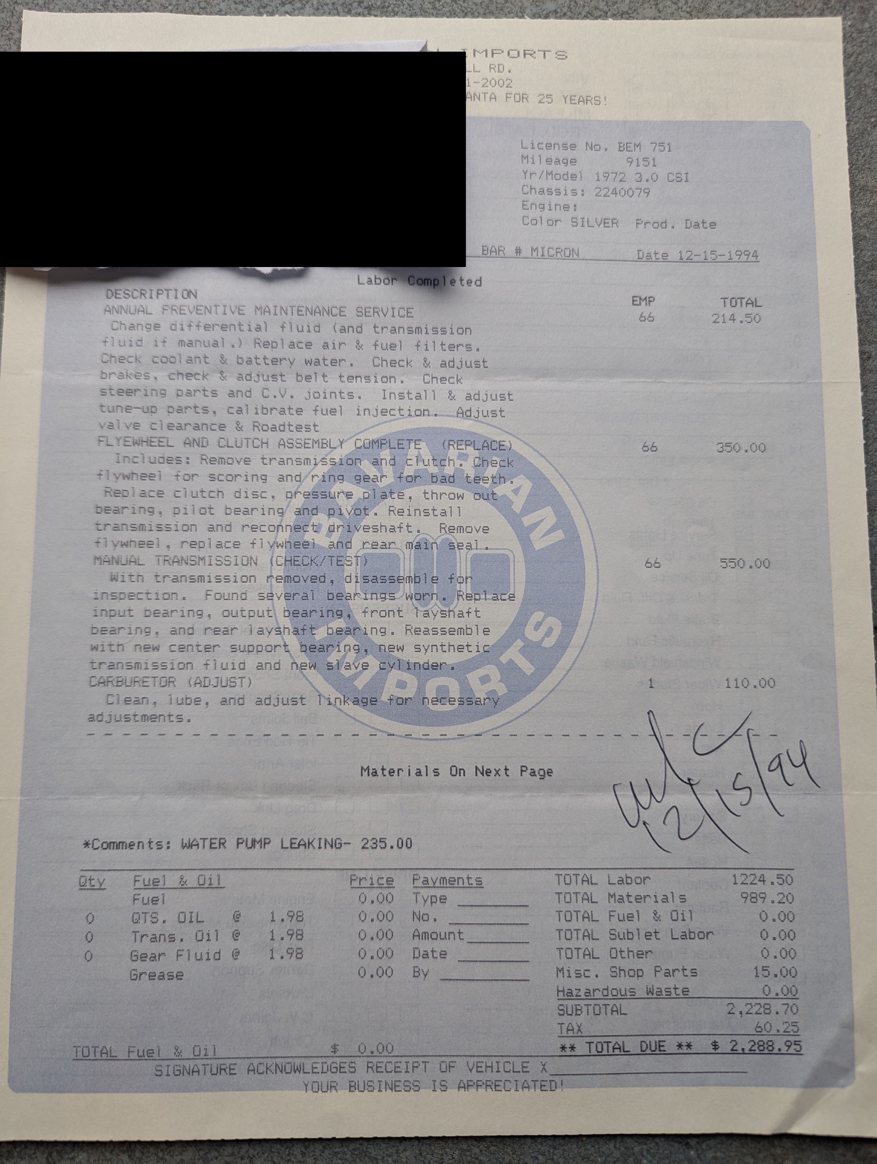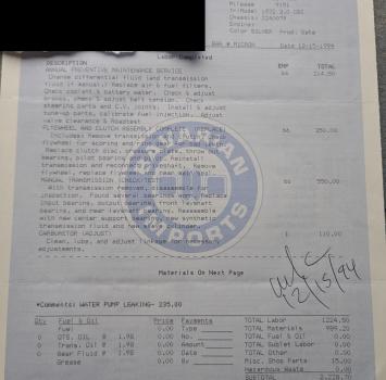 Annual servicing with various fluid flushes performed and an extensive servicing of the transmission, with the clutch, various bearings, and other components replaced.