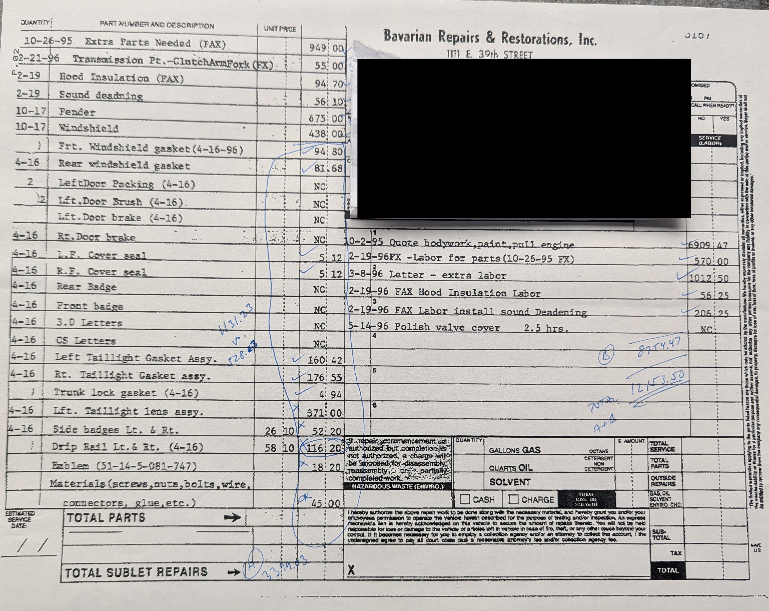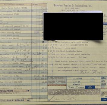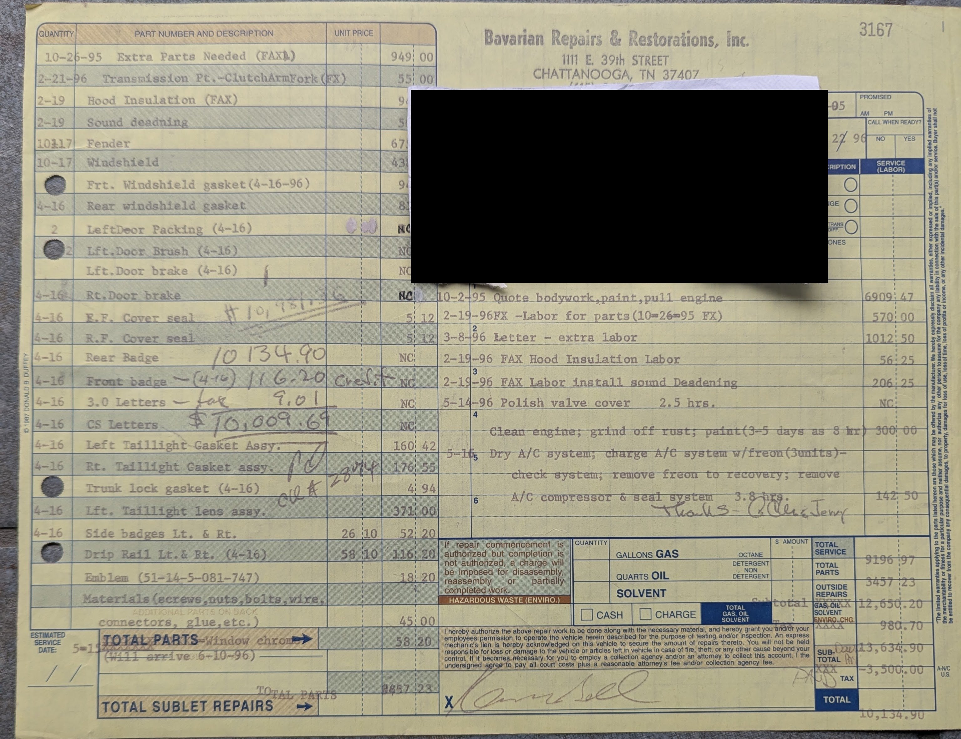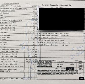 Vehicle 1972 BMW 3.0 CS Coupe Read more about 1972 BMW 3.0 CS Coupe Maintenance Date 05/15/1996 Maintenance Summary Final bill for comprehensive bodywork restoration and A/C system repairs. Maintenance Images