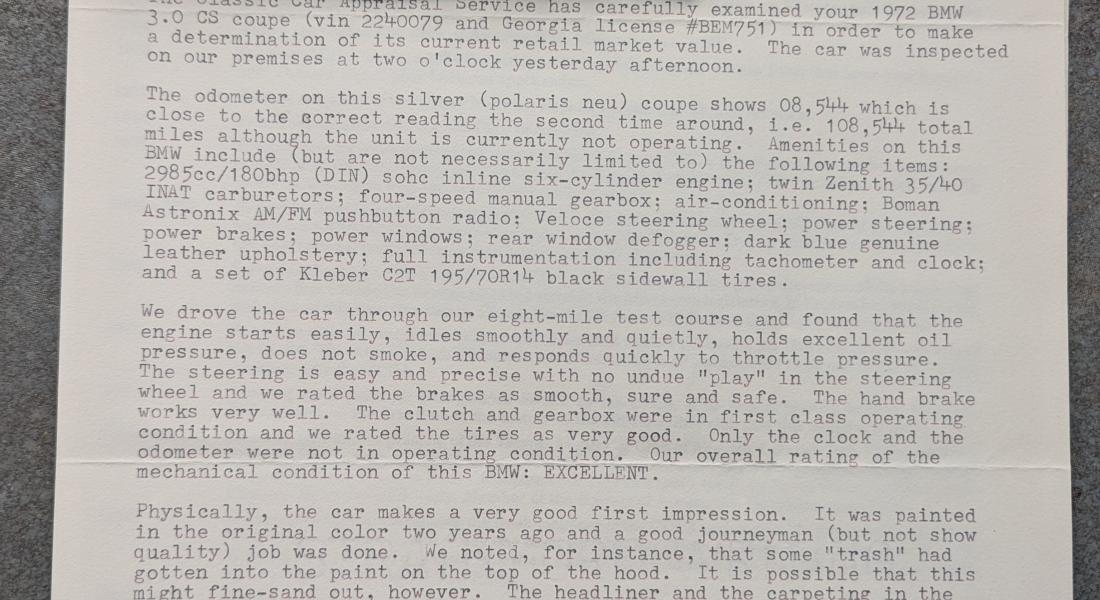 Vehicle 1972 BMW 3.0 CS Coupe Images Background Summary This is a report from the early 1990s assessing the car's condition and market value.