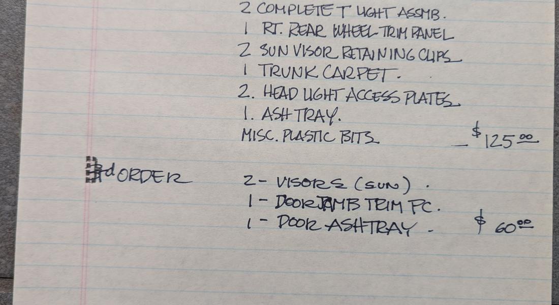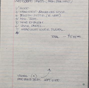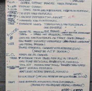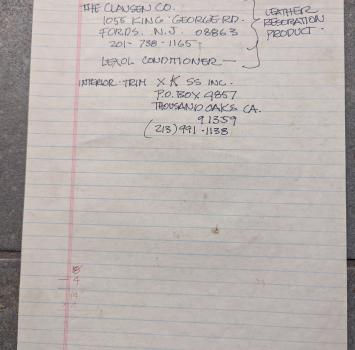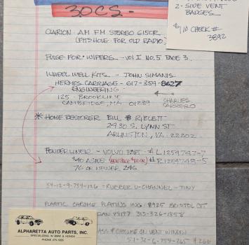 This is a collection of notes from a previous owner showing names of restoration shops, parts suppliers, resources for needed materials/parts, and a list of mechanical needs at the time.