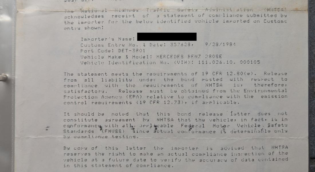 NHTSA letter of importation