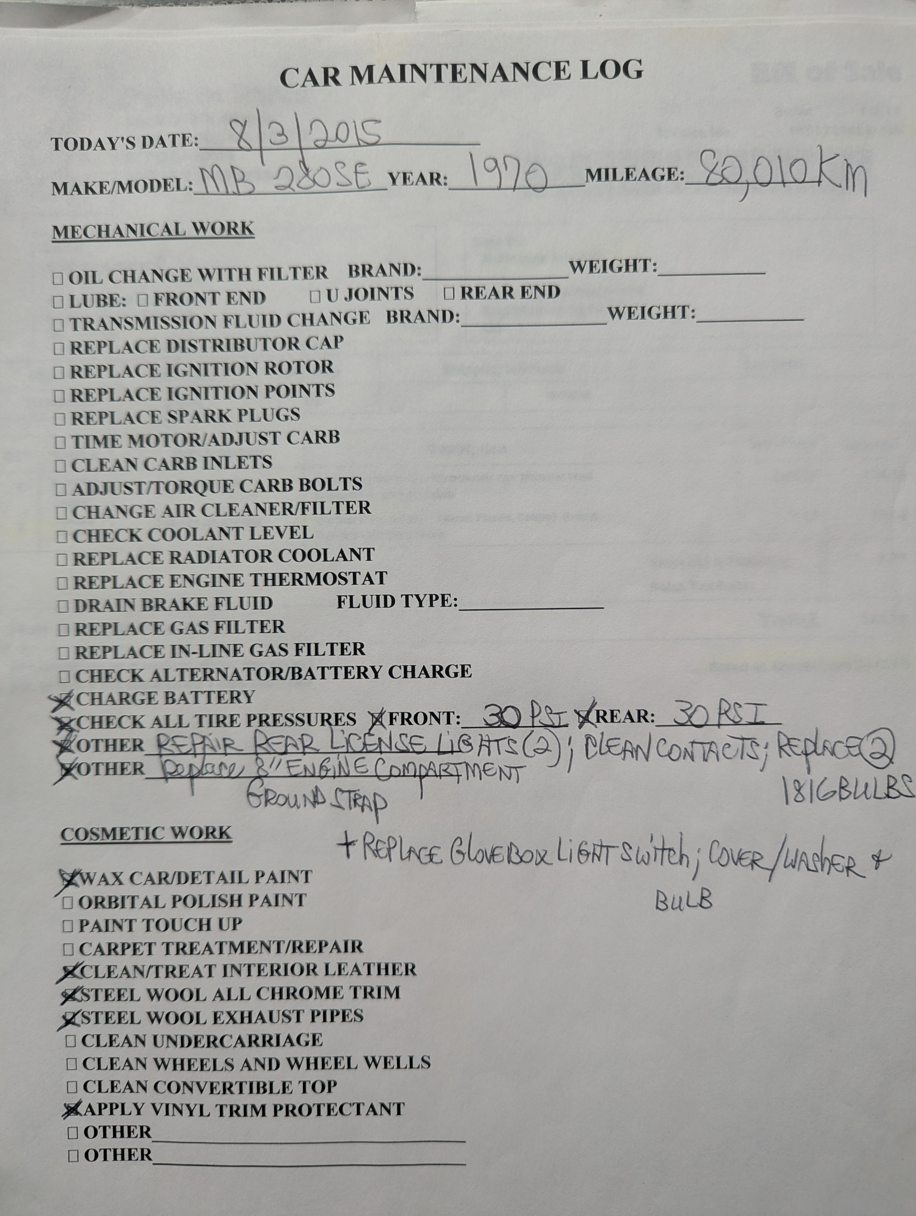 Vehicle 1970 Mercedes-Benz 280SE 3.5 Read more about 1970 Mercedes-Benz 280SE 3.5 Maintenance Date 08/03/2015 Maintenance Summary Rear license plate bulbs repaired/replaced, glove box light replaced, battery ground strap replaced Maintenance Images