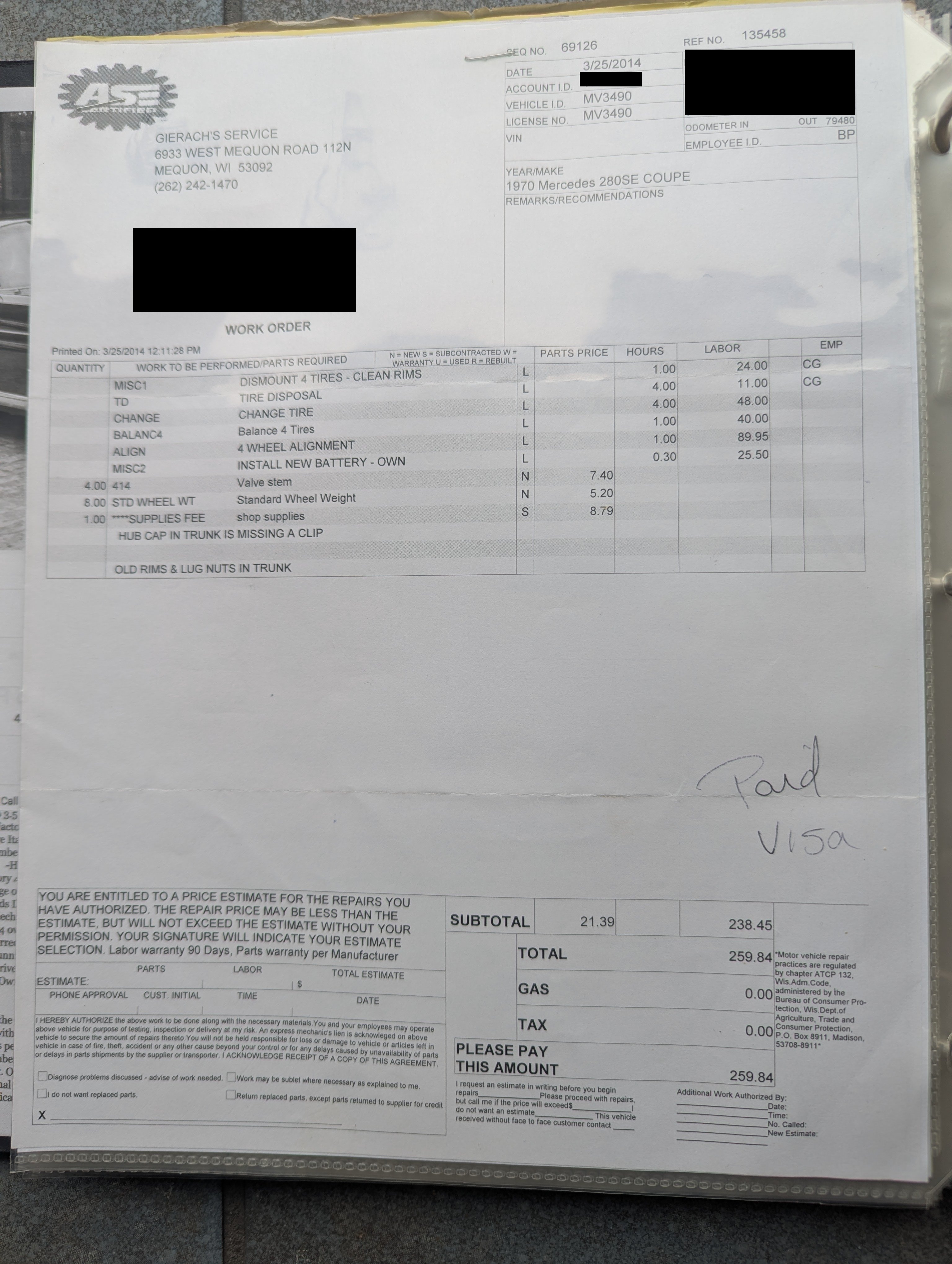 Vehicle 1970 Mercedes-Benz 280SE 3.5 Read more about 1970 Mercedes-Benz 280SE 3.5 Maintenance Date 03/24/2014 Maintenance Summary Four tires mounted and balanced along with a four-wheel alignment being performed. The owner provided a new battery for replacement at the same time. Maintenance Images