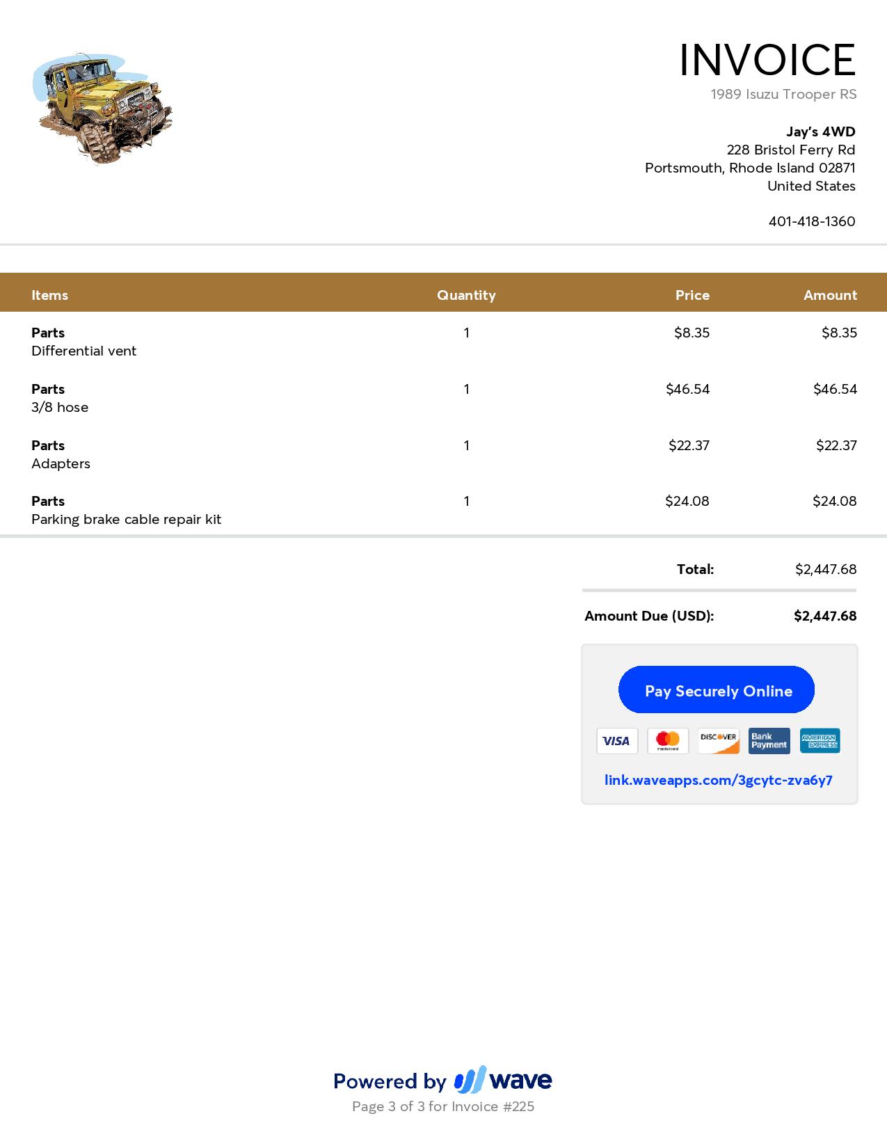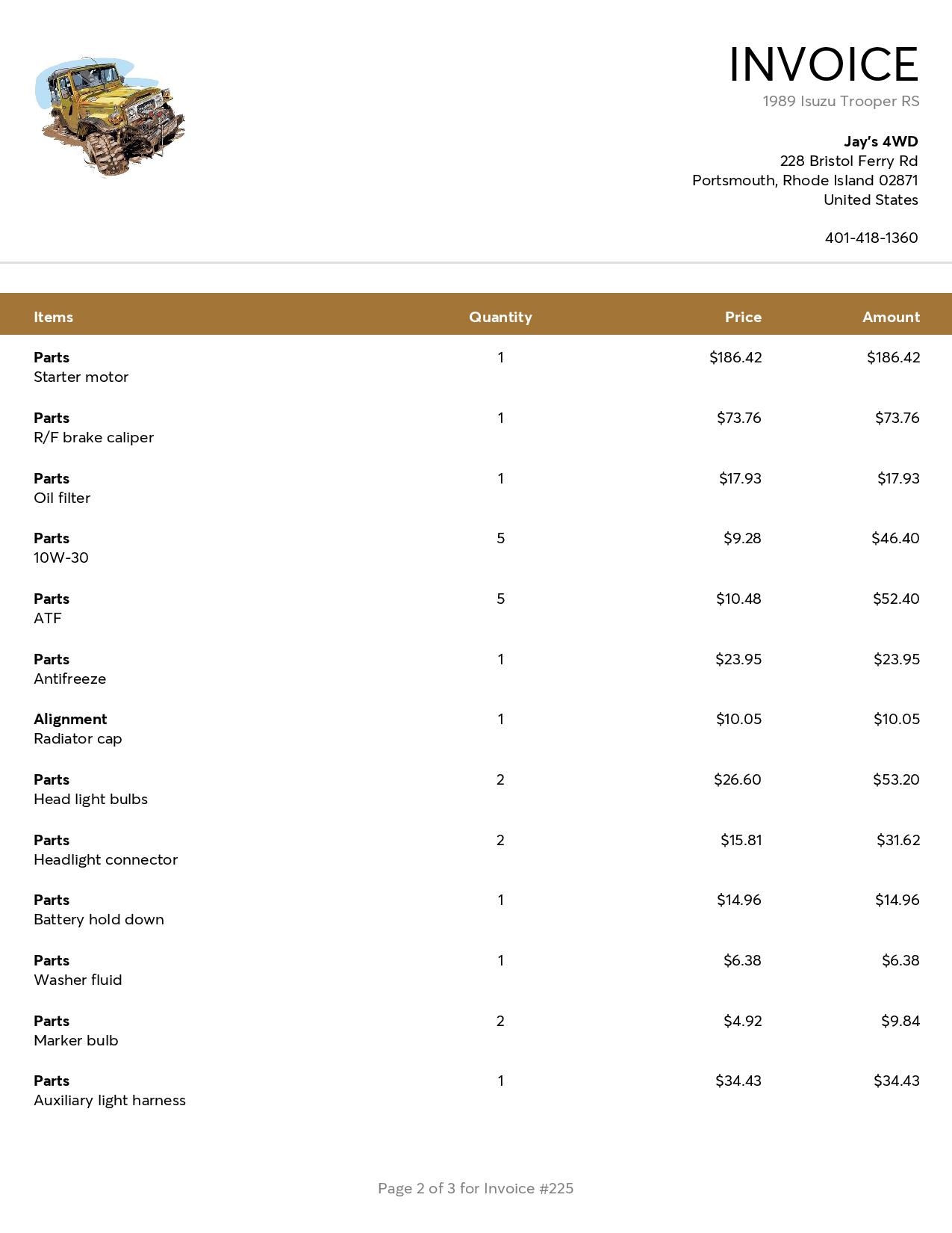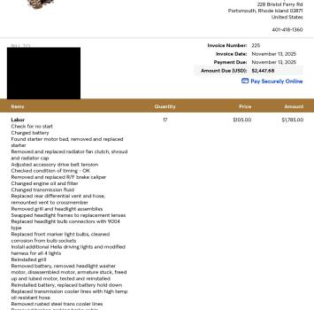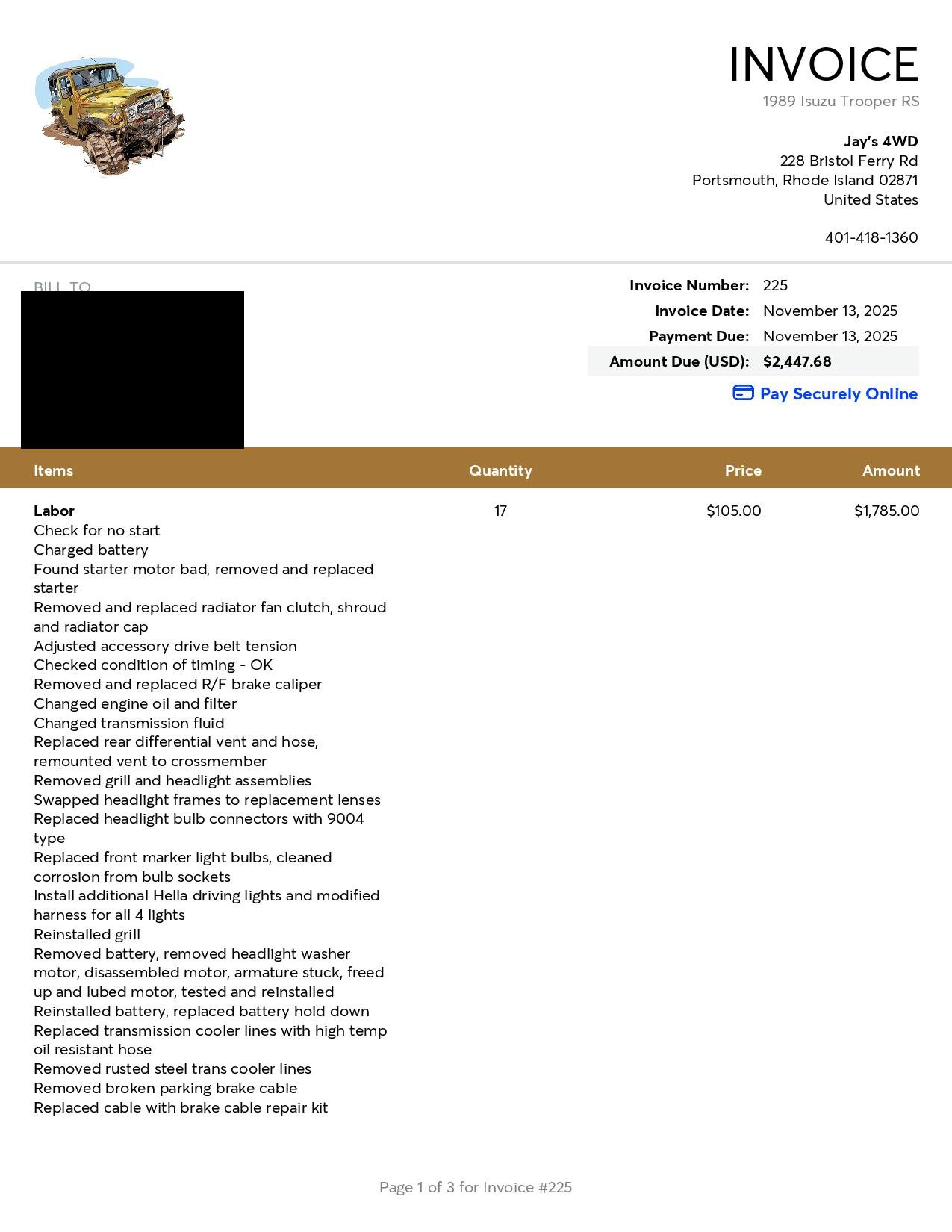 A variety of seasonal services including starter replacement, fluid changes, transmission line replacement, vent hose on diff replacement, repair/replacement of stuck caliper, and miscellaneous fixes.