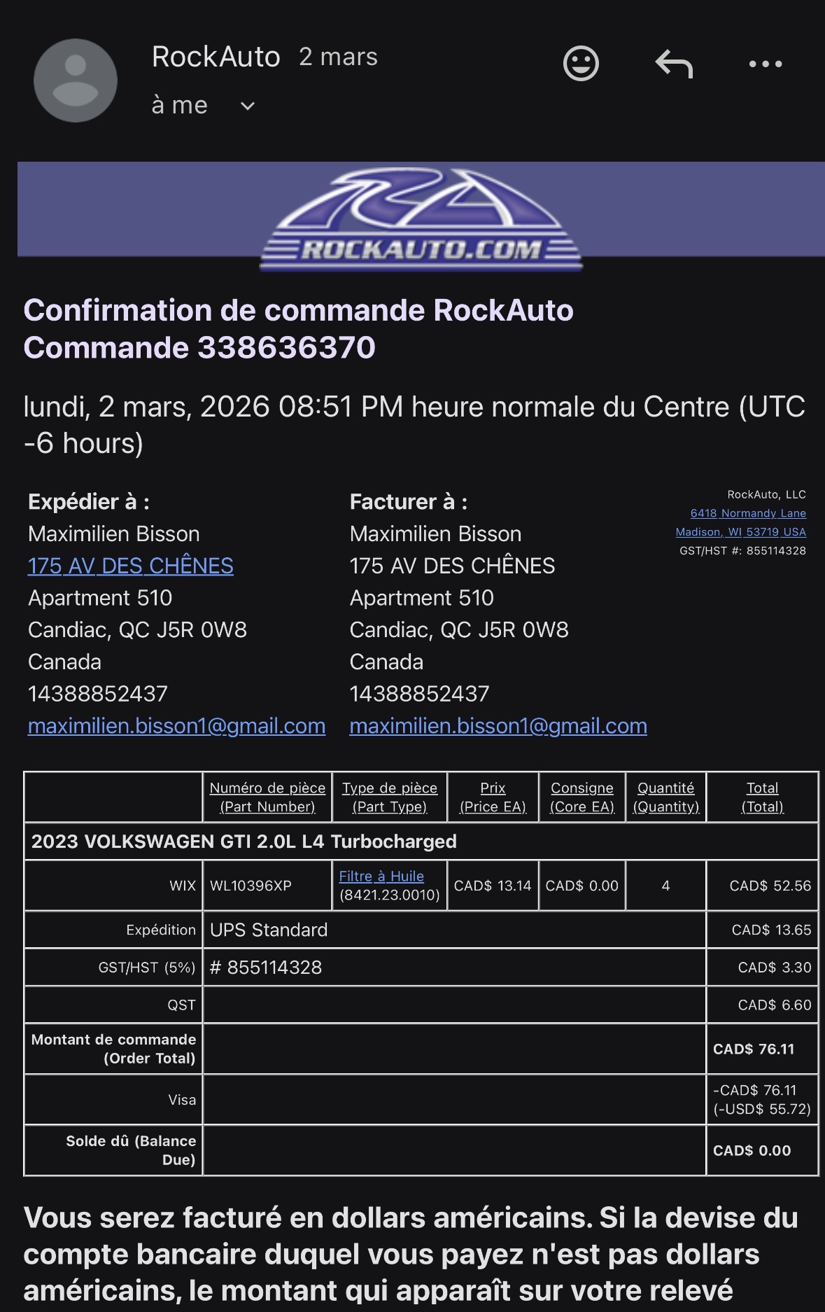 Vehicle VW GTI 2023 Read more about VW GTI 2023 Odometer 40,000 Maintenance Date 03/09/2026 Maintenance Summary 76$ pour les 4 Maintenance Documents IMG_3035.jpeg362.71 KB