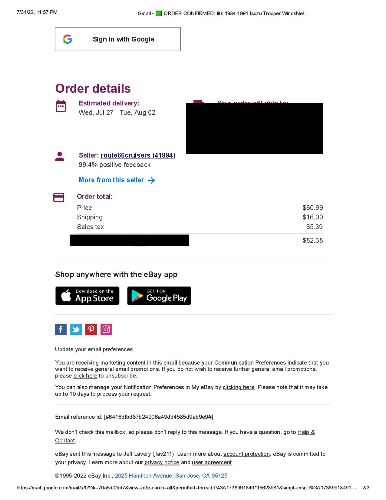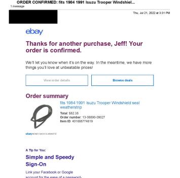 Vehicle 1989 Isuzu Trooper RS Date 07/31/2022 Receipt(s) Image Cost $82.38 Description Replacement windshield seal / weatherstripping