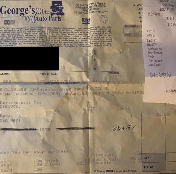 Vehicle 1989 Isuzu Trooper RS Date 10/01/2022 Receipt(s) Image Cost $63.29 Description This is a used OEM antenna to replace the broken assembly on the Trooper RS.
