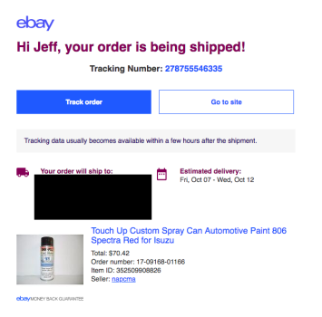 Vehicle 1989 Isuzu Trooper RS Date 10/09/2022 Receipt(s) Image Cost $70.42 Description The correct product - single stage Spectra Red spray paint with clear mixed in.