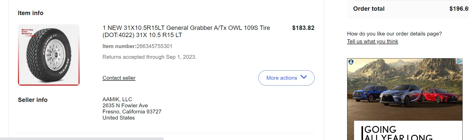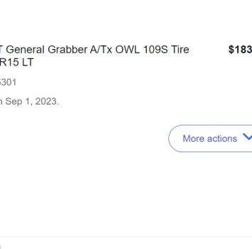 Vehicle 1989 Isuzu Trooper RS Date 07/27/2023 Receipt(s) Image Cost $183.82 Description This is just a 5th General Grabber ATX tire to replace the rotten spare on the back of the Trooper.