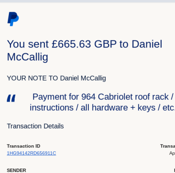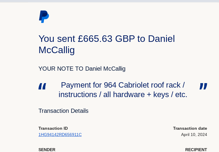 Vehicle 1990 Porsche 911 C4 Cabriolet Date 04/16/2024 Receipt(s) Image Description Rare OEM roof rack for Cabriolet models