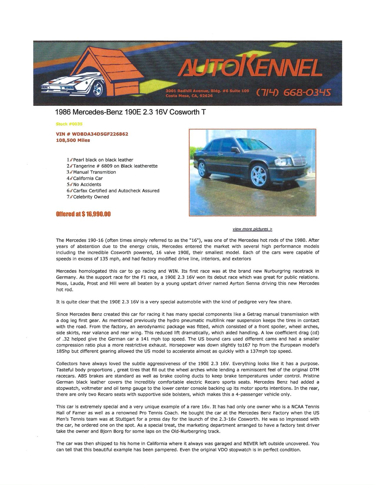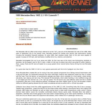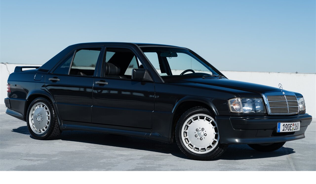 This is a one-owner 190E 2.3-16 in rare Blue-Black Metallic. It shows just over 115,000 miles and has been carefully preserved in mostly stock condition, with alterations limited to European headlights and upsized Gulli wheels.